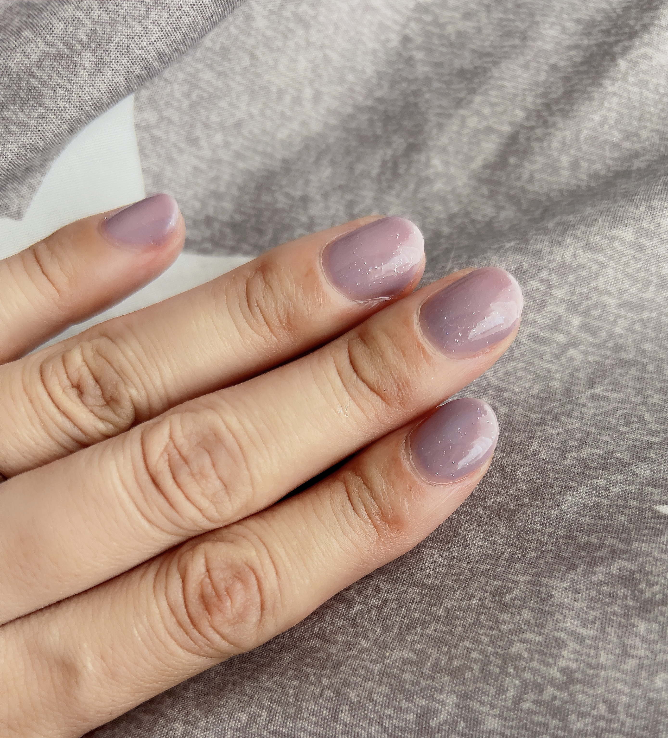 ベース・トップ・カラーの3役が1本になり、さらにリムーバーいらずでペリっと剥がすだけでオフできるという面倒くさがりに最高なジェルネイルです✨ とっても塗りやすく、筆は小指の爪をひと塗りでほとんど塗れるサイズ感。 さらにムラになりにくく、塗るのがヘッタクソな私でさえも綺麗に塗れちゃいます! NE-150 Smoky Purpleはくすみのあるラベンダーカラー! ラメ入りのシアーカラーで、ラメはチラチラと入っている程度。 1度塗りだと自爪の色が透けてナチュラルに色づき、 2度塗りだと自爪の色は目立ちにくくなりますが、透明感を残しつつ綺麗なラベンダーカラーの爪に仕上がります🫶