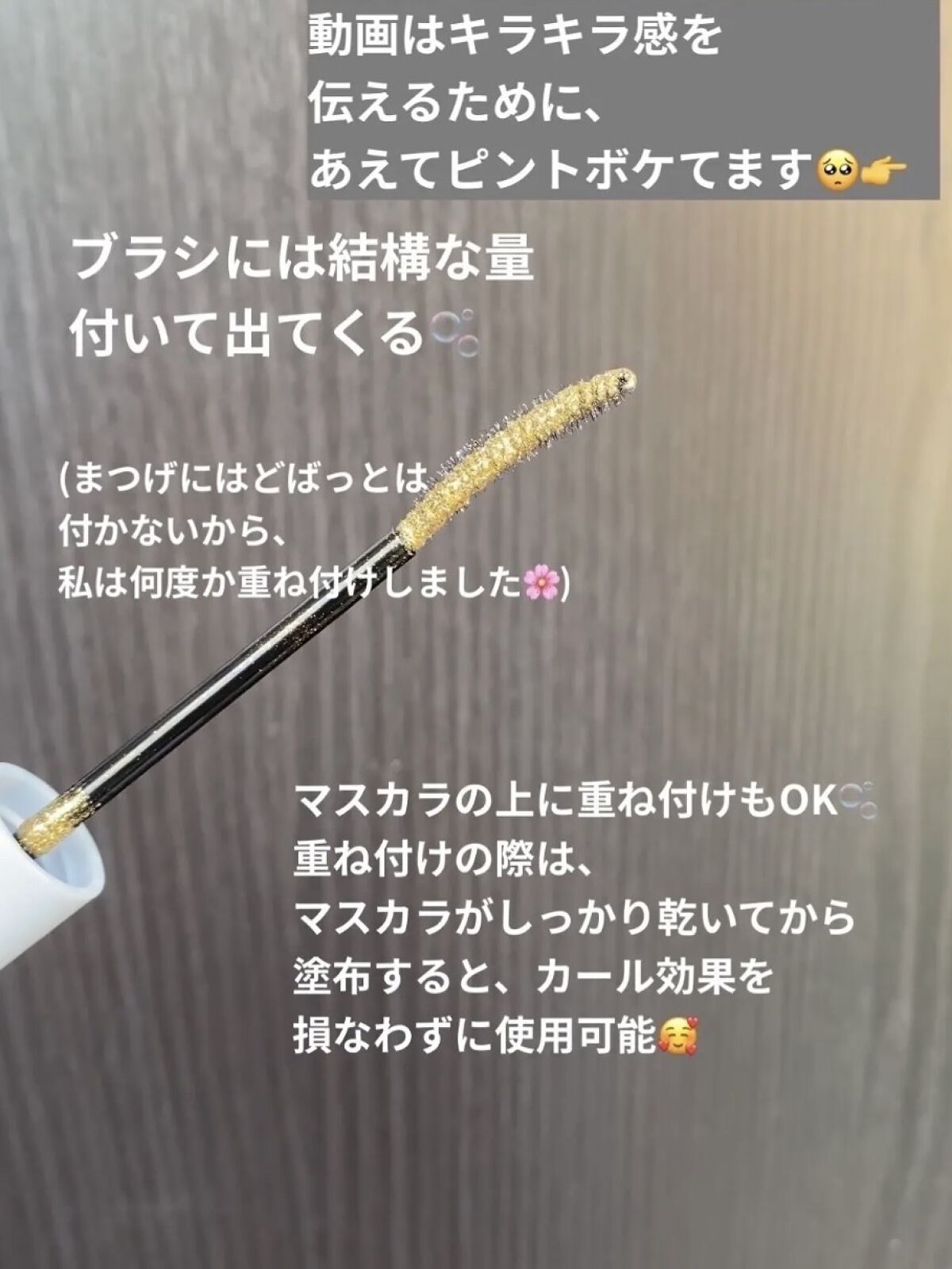 まつげに直接or手持ちマスカラをのせたあと完全に乾いてから塗布します。 ブラシは細めでまつげにフィットして塗りやすい。 トップコート成分が配合されているため、まつげをツヤっと見せてくれるしラメをコートしてくれてラメ落ちしにくく長持ち◎ まつげが動くたび、きらきらっと輝きます。 グリッターマスカラなので、液は重ため。 まつげにブラシをちゃんとフィットさせるのが大事◎ (写真見てもらえばわかるけど、シルバーのほうがちゃんとラメものってるしカールキープもね😂お許しを)グリッターマスカラは初めてなので使いこなせるよう工夫してみます!