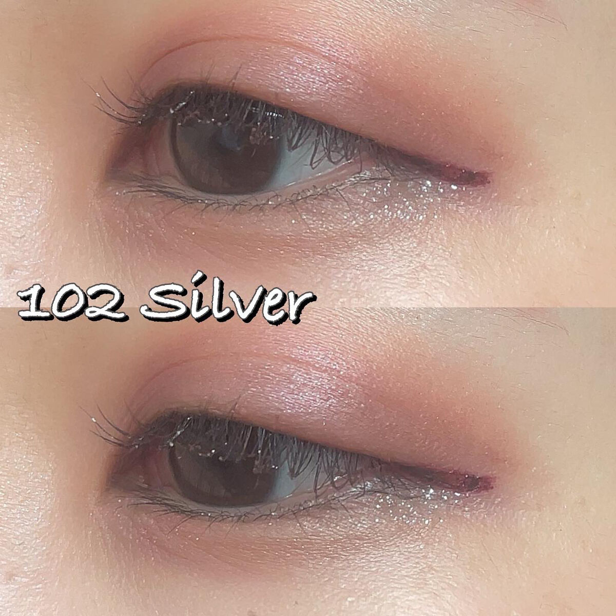 直接自まつ毛につけてもいいし、いつも使ってるマスカラの上から重ねてもOK。 トップコート成分配合。しっかりとラメをコートするため、ラメ落ちしにくくつけたてのカールが長時間持続します。 フェザーフィット成分配合。つけている感じがしない、ふわっと軽い使用感で、一体化したようにメイクになじみます。 塗るとトップコート成分のおかげでまつ毛がツヤツヤに見えてキラッとしたラメが際立ちます。 101ゴールドは華やかなゴールドラメでキラキラとした明るい目元に。 102シルバーは透明感のあるシルバーラメ。潤んだツヤキラな目元になります。 どちらのカラーも控えめなラメでギラギラした感じではなく、さりげなくラメがつく感じです。 控えめなので大人でも使えるグリッターマスカラです◎