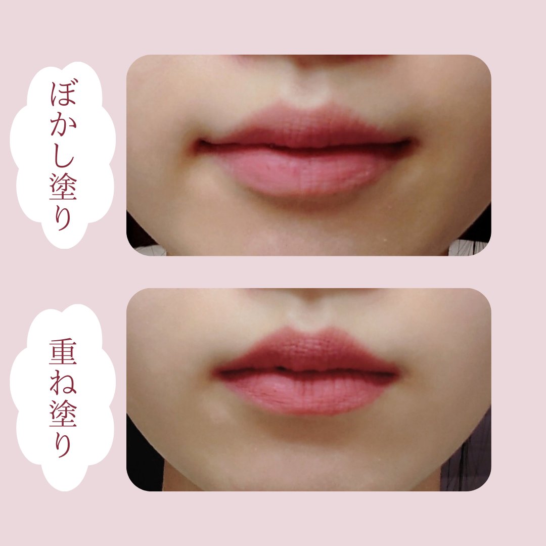 滑らかな質感で、非常にぼかしやすいです。 直に重ね塗りをすれば、はっきりした発色になるので、濃いと思う方はぼかし塗りがおすすめです。 色が残りやすく、昼休憩でご飯を食べた後でも色持ちがよかったです(個人の感想)。 リップの内容物がアプリケーターにボロボロとくっついて、塗りにくいこともあるので、一度ティッシュか手の甲で調整してから塗ると簡単だと思います。