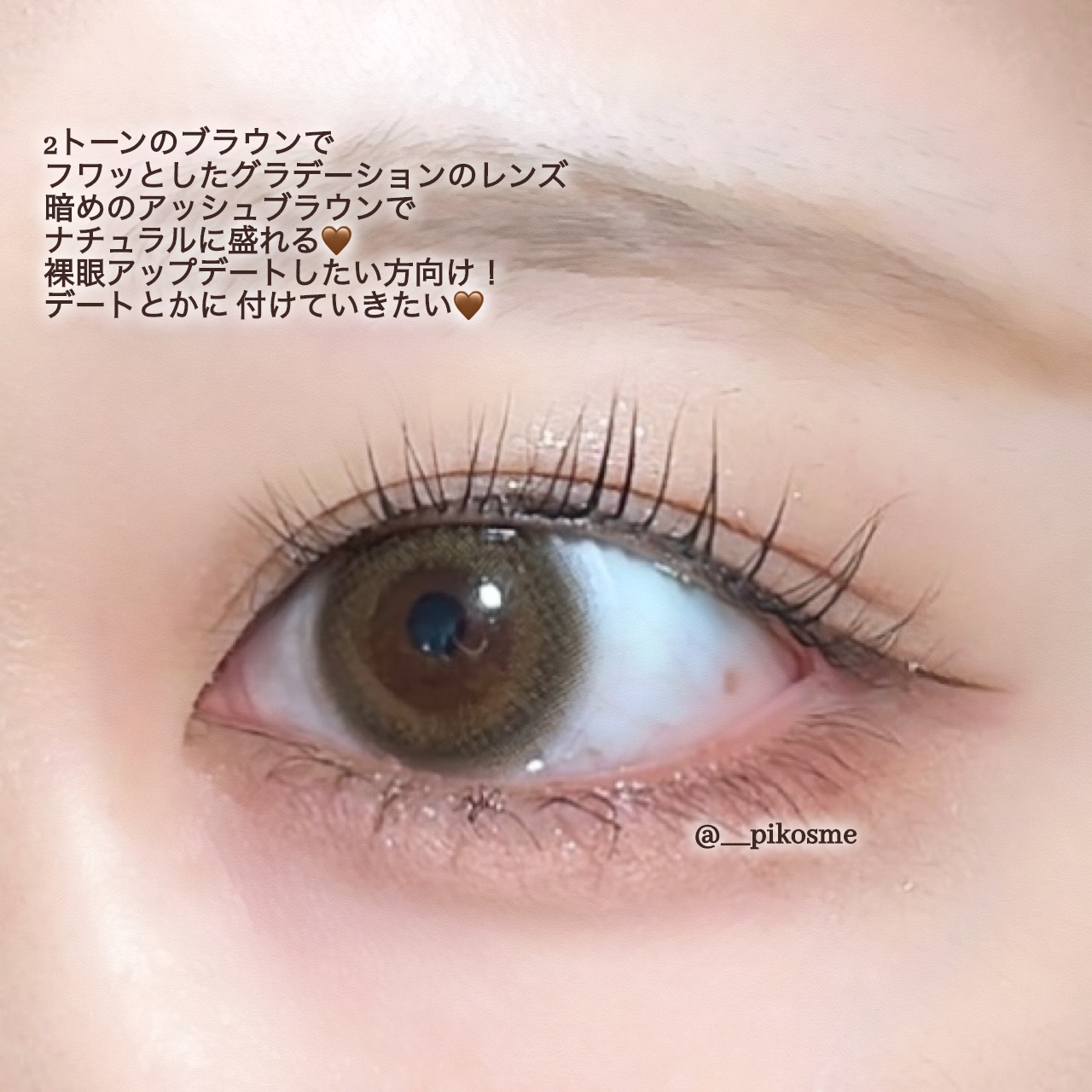 透明感のあるナチュラルアッシュブラウンで、毎日使いしやすいカラコン✨ ほんの少し瞳を大きくしてくれて学校や職場でも使いやすくてオススメ💓 ふんわりフチで抜け感を演出