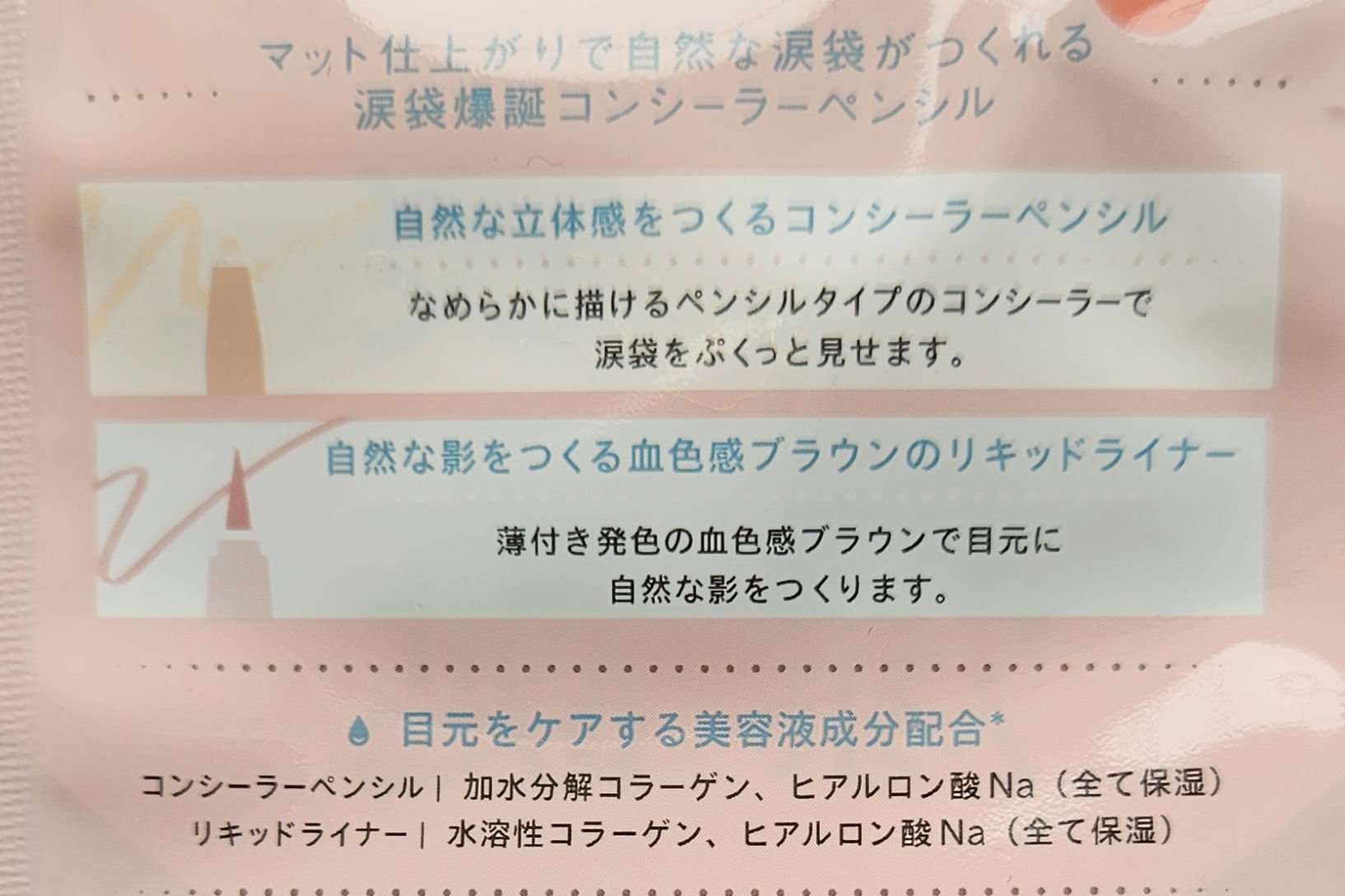 - マット仕上がりで自然な涙袋がつくれる 涙袋爆誕コンシーラーペンシル <ピンクベージュ> ○目元美容液成分配合 コンシーラーペンシル:加水分解コラーゲン、ヒアルロン酸Na(全て保湿) リキッドライナー:水溶性コラーゲン、ヒアルロン酸Na(全て保湿) ○テクニックいらずぷっくり涙袋 【自然な立体感をつくるコンシーラーペンシル】なめらかに描けるペンシルタイプのコンシーラーで涙袋をぷくっと見せます。 <ぷっくり涙袋のつくりかた> 1.目の下3~5㎜を目安に、ぷっくりみせたい幅にコンシーラーで涙袋を描きます。指でぼかすとより自然に仕上がります。 2.コンシーラーで作った涙袋の下にリキッドで涙袋の影を描きます。すぐに指でぼかすとより自然に仕上がります。 【自然な影をつくる血色感ブラウンのリキッドライナー】薄付き発色の血色感ブラウンで目元に自然な影をつくります。