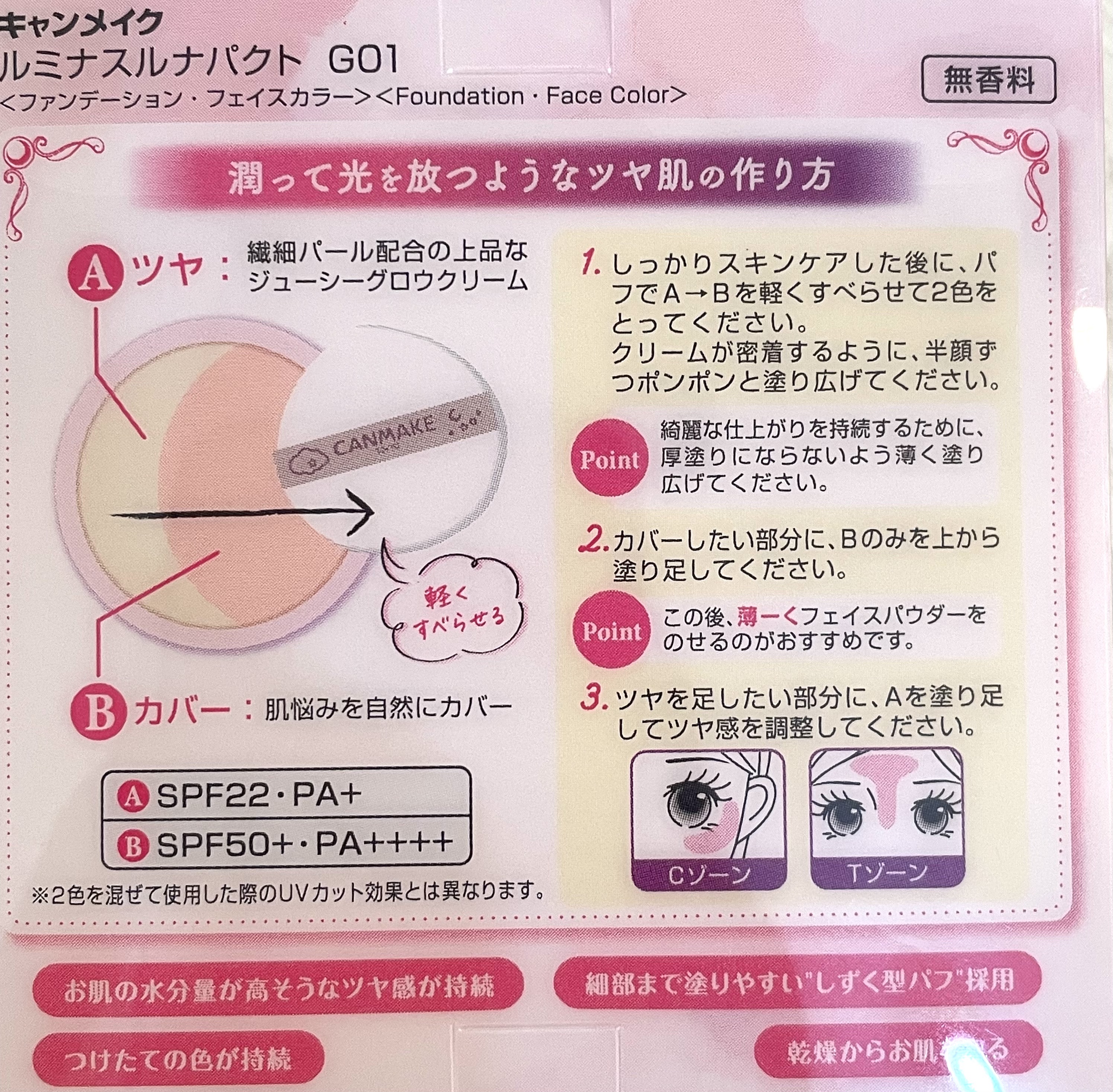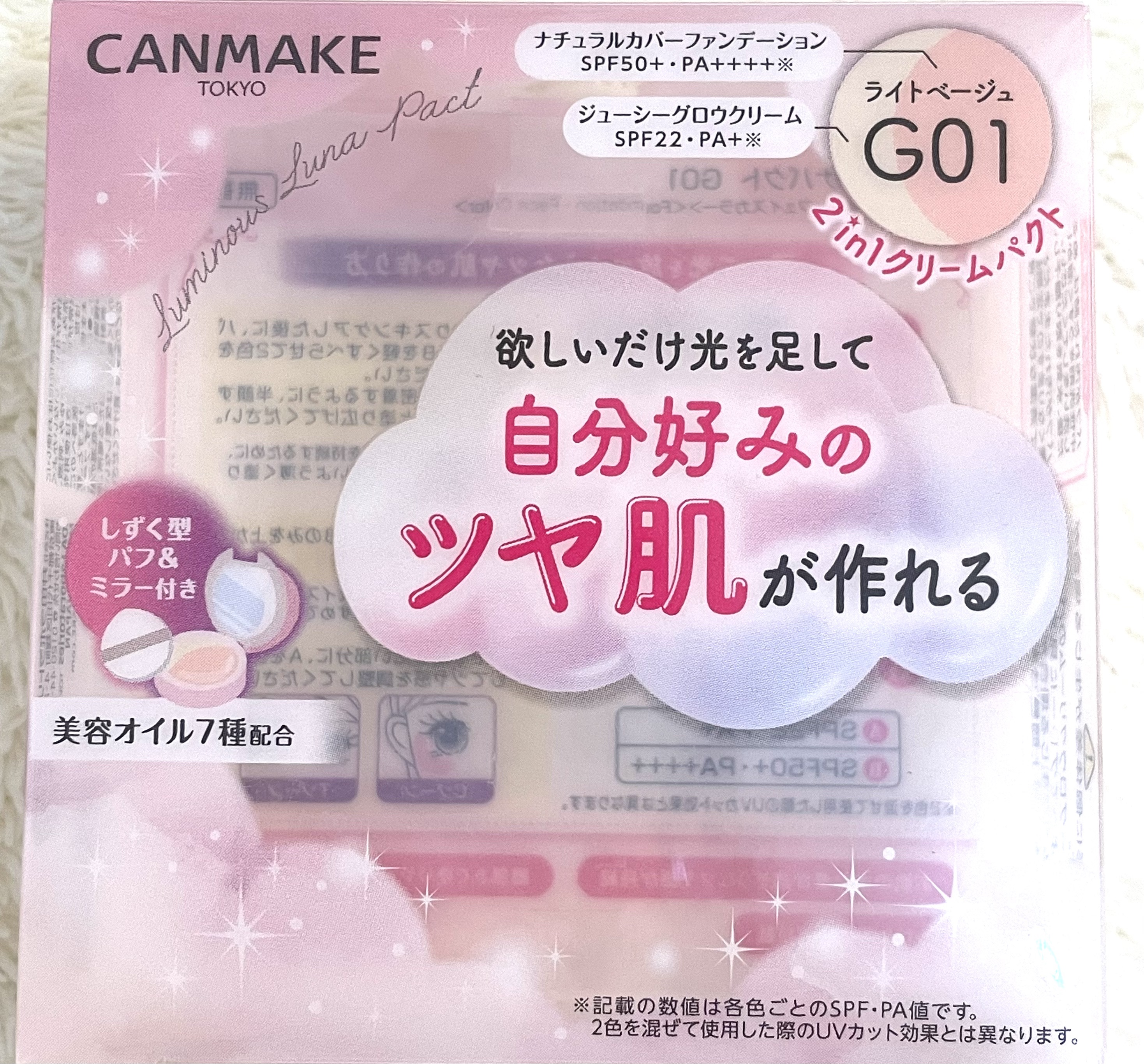 キャンメイクルミナスルナパクトG01ライトベージュSPF値も高く良い商品だなと思ったのですが密着度が弱い崩れやすさを感じました10代から20代初めの方が日焼け止めの代わりに使うくらいうすーく使うと綺麗かも✨使用料や組み合わせなどちょっと難しか...