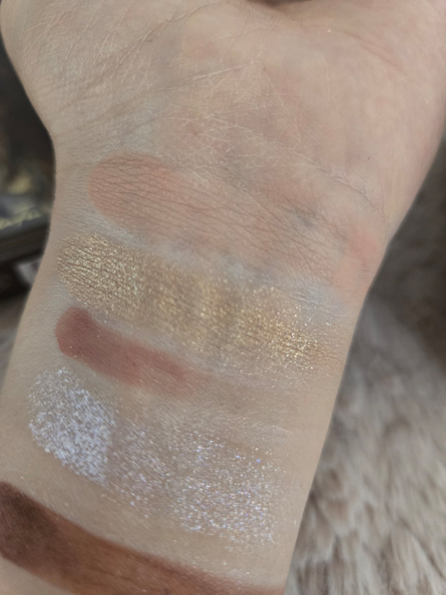 6色セットのアイシャドウでラメ入りが2色。 服装や気分によって組み合わせを変えたり単色で楽しんだりも出来ます😊 ブルベの私からすると使いやすい印象の色味です✨ 残念だったのはブラシやチップが付属されていない点でしょうか💦 ベースや締め色によって発色は差が出るのかもしれませんが、ベストなブラシやチップを探しながら使っていこうと思います😊