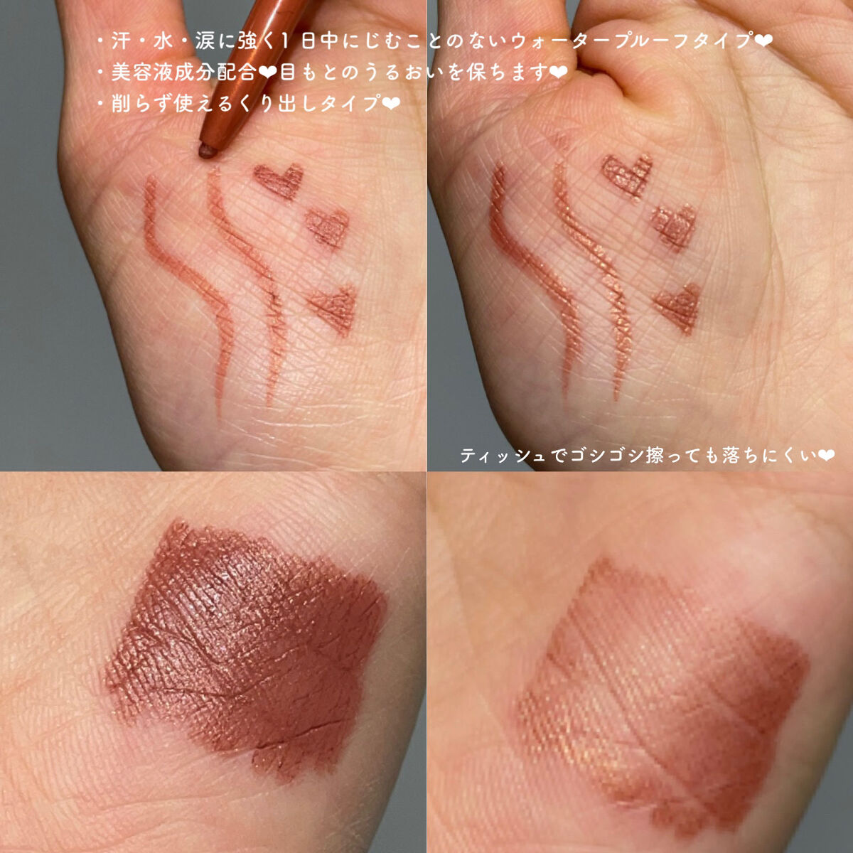 ⭐️とろけるようなタッチで濃くも薄くも印象自在。 ⭐️肌なじみブラウンで抜け感、なのに 印象的な目もとを叶える2mmのペンシルアイライナー ⭐️髪の色や瞳の色、なりたい印象に合わせて選べる、 ブラウンに特化したカラーバリエーション。 ⭐️肌なじみの良い絶妙なニュアンスのブラウンで、 透明感のある目もとを叶える ⭐️体温付近でとけるワックス配合。 とろけるような描き心地で、まつ毛の隙間の埋め込みや、 はねあげなどの繊細なライン、 下まぶたも簡単・自在に描くことができる。 ⭐️まぶたへの密着性が高いため、 仕込みラインがにじまず長時間続く。 ⭐️汗・水・涙に強く 1日中にじむことのないウォータープルーフタイプ。 ⭐️美容液成分配合。目もとのうるおいを保つ。 ⭐️削らず使えるくり出しタイプ。 ⭐️無香料 ⭐️美容液成分【コラーゲン・スクラワン】(保湿)