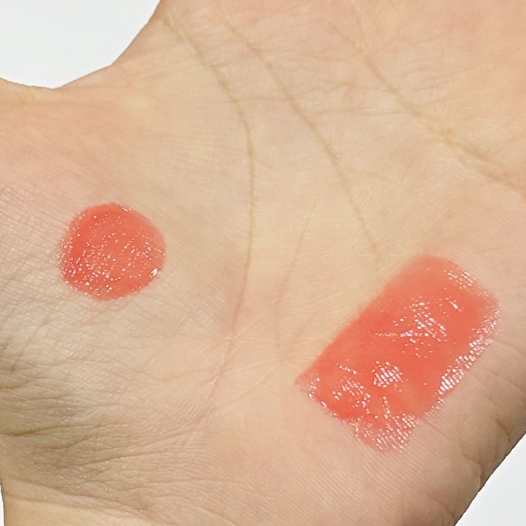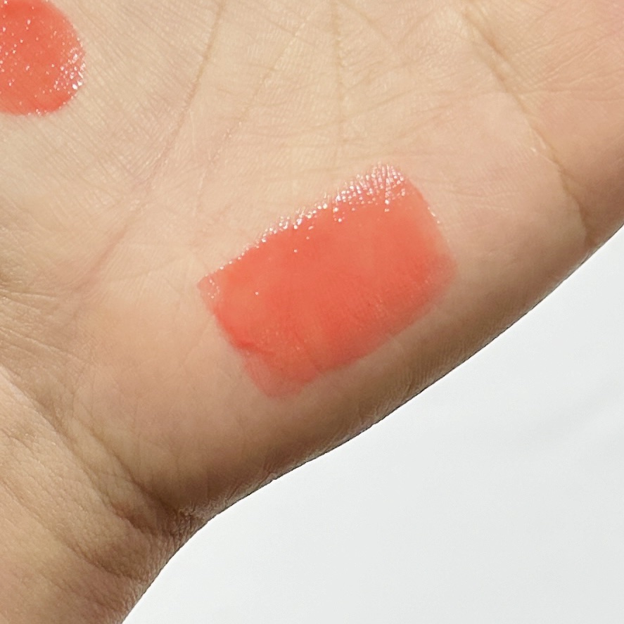 肌に乗せた感じは白っぽさのあるオレンジ系ピンクというかミルキーコーラルオレンジ。イエベさんが得意だろうなと思う色です。 ツヤはじゅわっとした水分感のあるほのかなツヤで可愛いです。 肌に乗せてすぐティッシュオフするとほのかに色が残る程度なので色持ちはまぁまぁかなという印象。 そして肝心の唇に乗せた時の発色ですがコーラルオレンジの印象がどっかにいってしまいものすごい蛍光ピンクに…😇 rom&ndのティントは私の唇には商品紹介ページの通り発色しないことが多く購入を迷ったのも正直なところ。 私の場合ティントがピンクや赤みが強く発色することが多いのですが今回は特に相性が悪かったようです😇 試しにリプモンの焦がした茶葉の余韻(とってもダークなブラウンリップ)の上にもつけてみましたが、それでもきつい蛍光ピンクで私にはもうどうしようもありません…😭