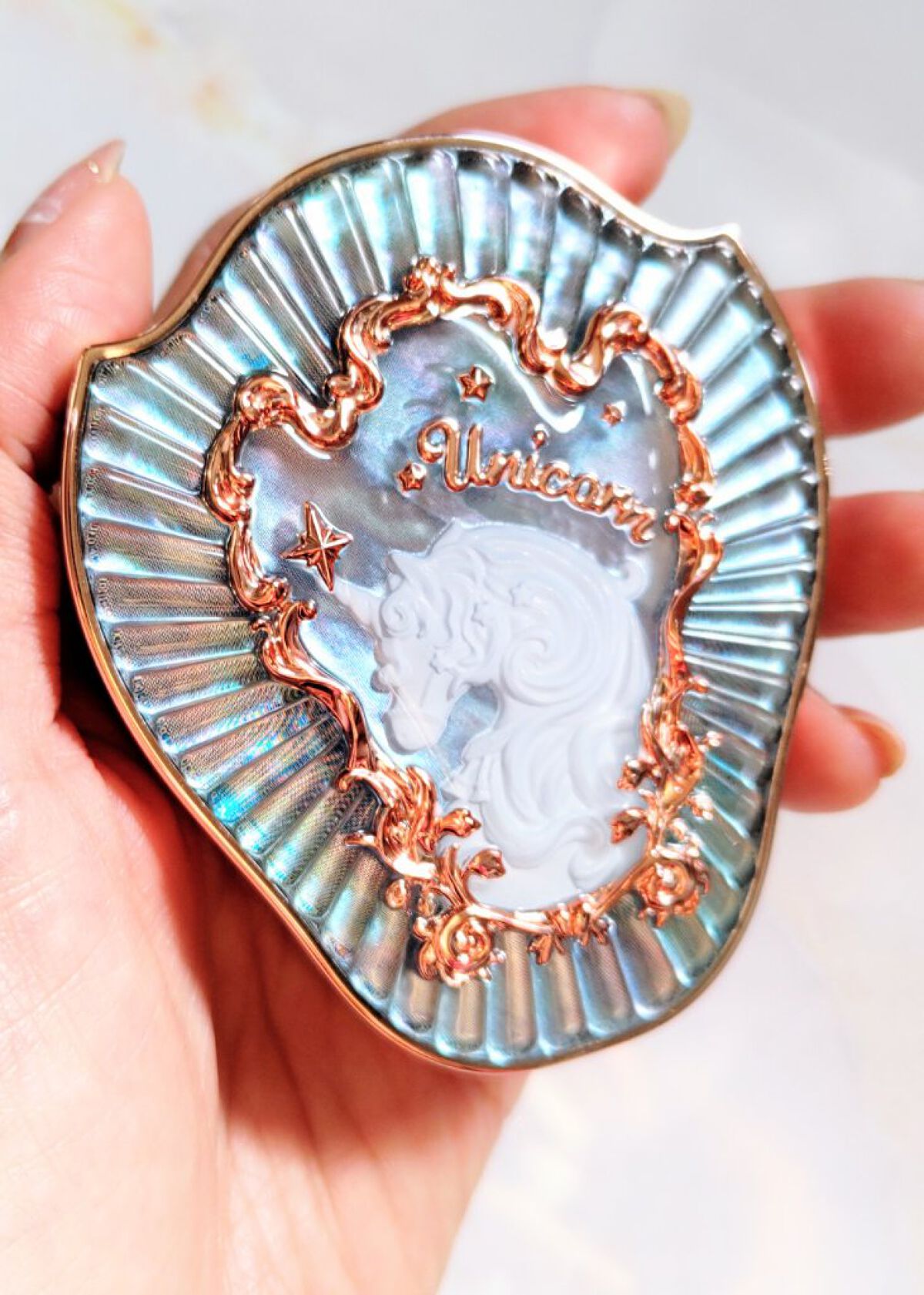 乙女心をくすぐるパケとチーク自体にもユニコーンの模様が彫られているのがとても素敵 ミラーがついているのもお直しに便利でいいですね 発色も粉質も良く、普段使いしやすいです