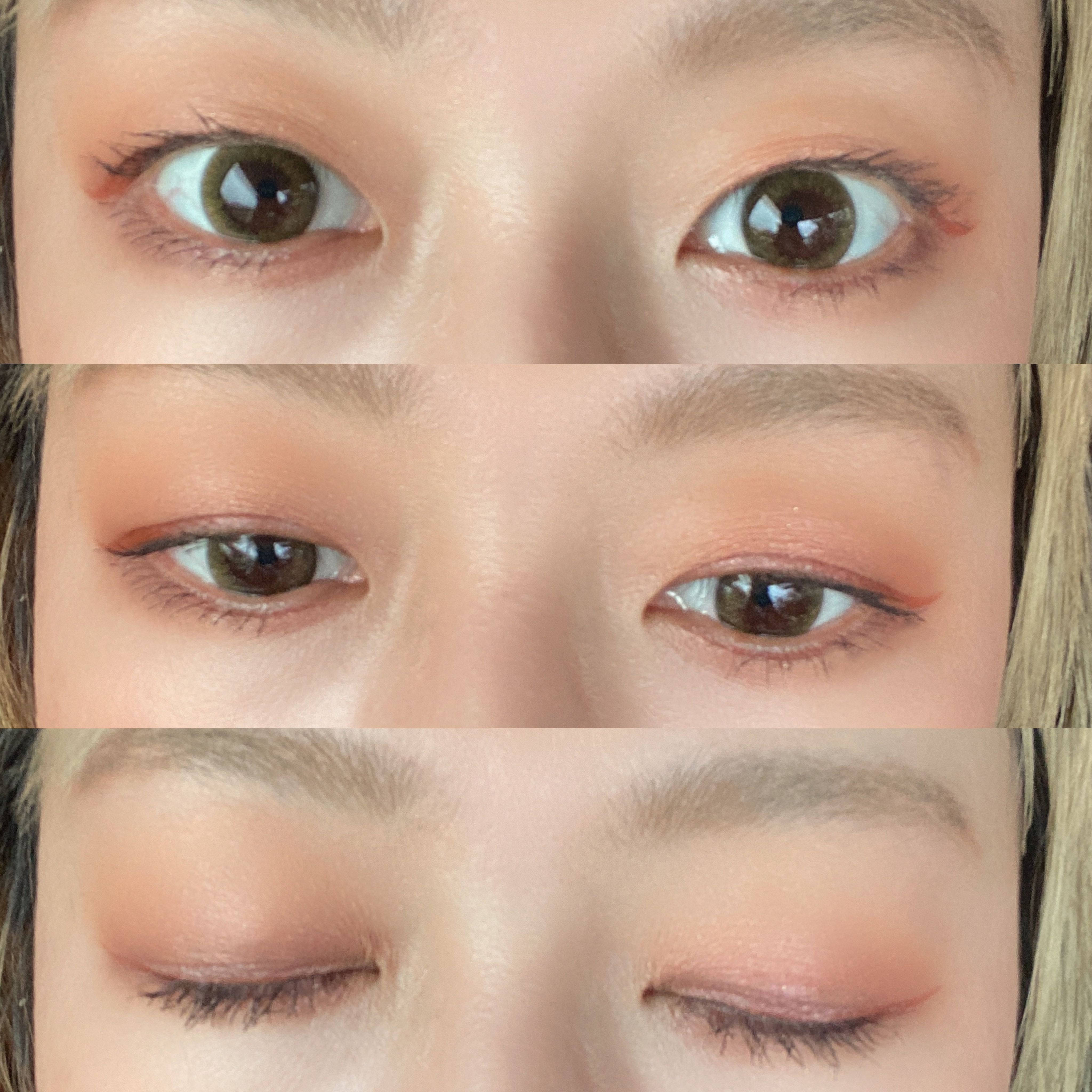 左下がまさかの青ラメブラウンなんです。 オレンジのクリームシャドウをアイホールに塗る。 締め色に左上の青ラメブラウン。 これだけでもう素敵で、左下で境目をぼかして右下で涙袋。 オレンジのクリームシャドウもサラサラで二重幅にたまらないし、ほんわり温かみのあるオレンジまぶたになる。