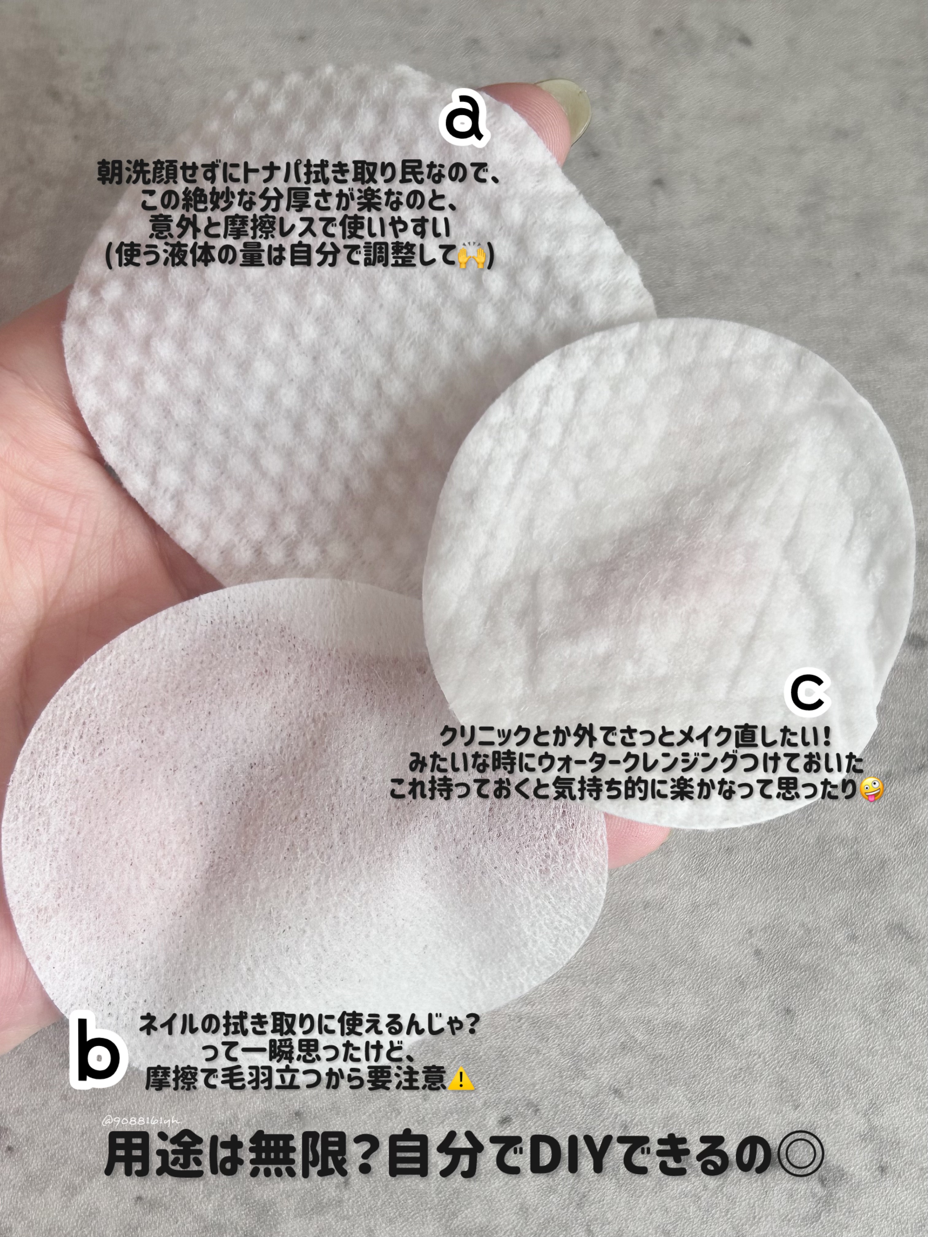 意外としっかりしてた 一応、美容垢なので笑 化粧水とか液体物がまあまあストック有り、そしてわたしは朝拭き取り派ってことで、3000KRWで買える、トナパ2種類買ってみた🛒 フラット面と凹凸面があって、生地は割としっかりしてる分、吸う← これにピーリング系の化粧水入れて朝洗顔にしてる☀️ DAISOと比較するとサイズ感小さめで一番生地がしっかり。良さは15枚で小袋に液を直接入れられるから持ち歩きに◎