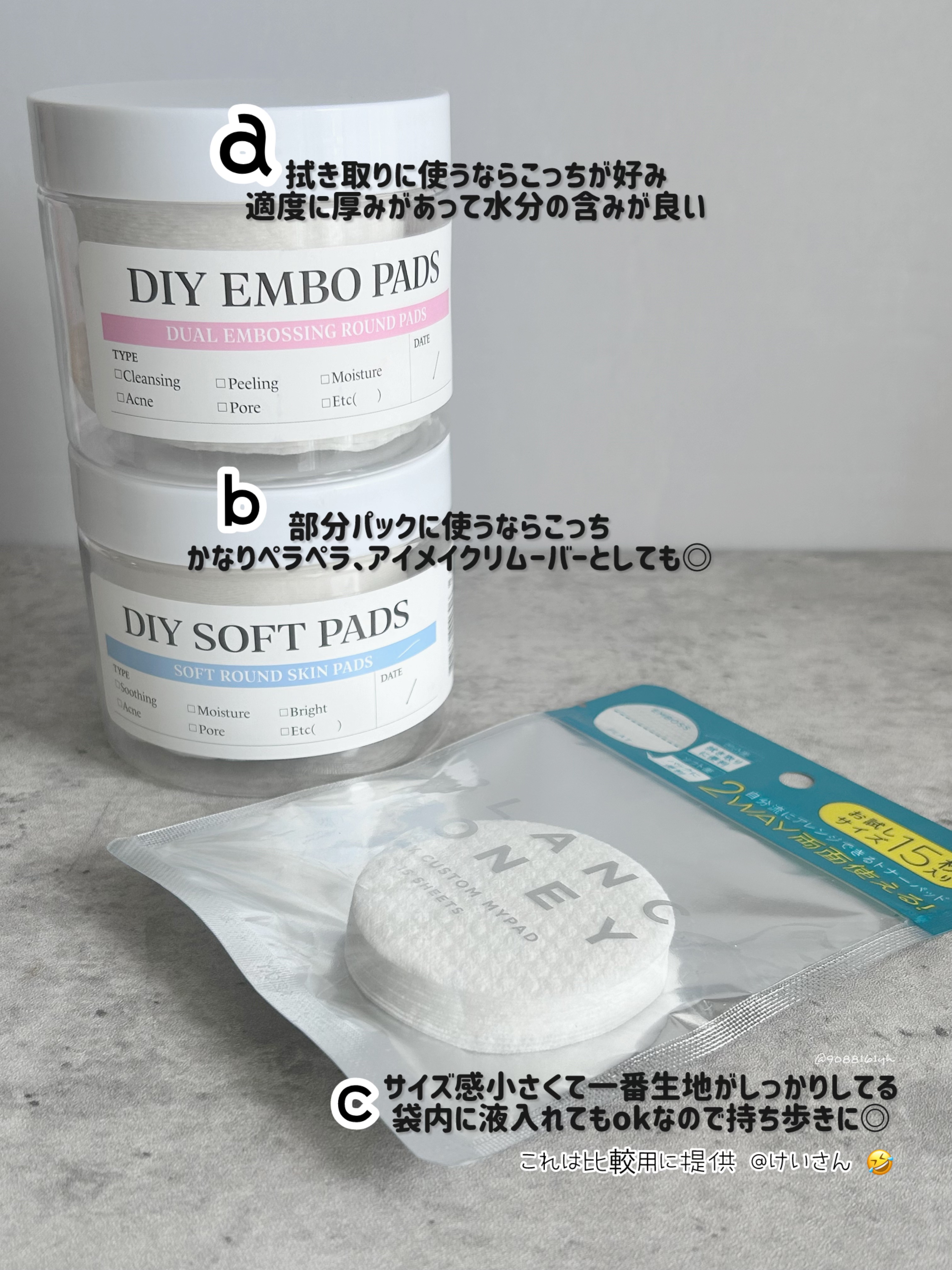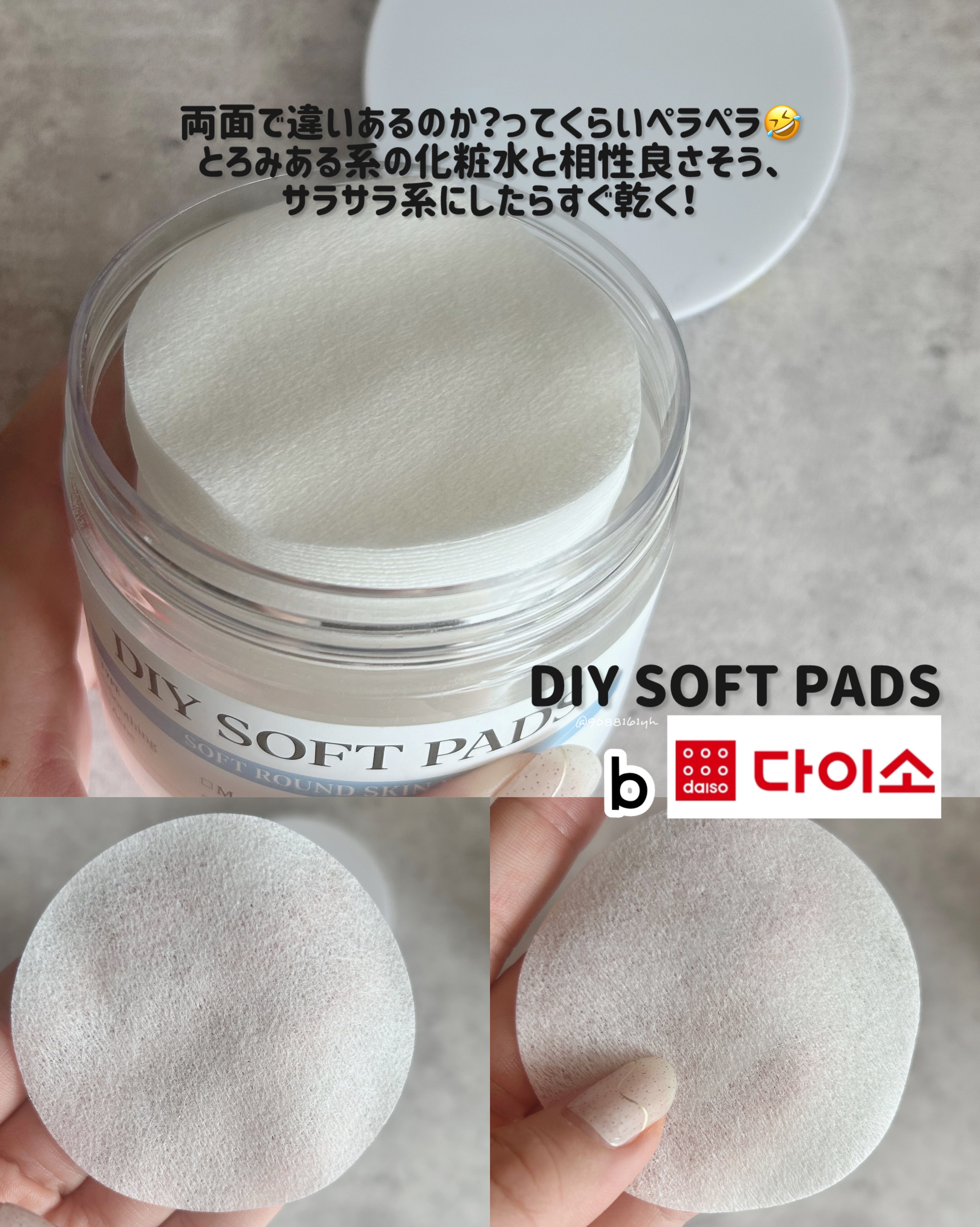 🗣️韓国DAISO購入品-------------------------------------------DAISO(韓国)@daisolifeDIYEMBOPADDIYSOFTPAD-------------------------------------------意外としっかりしてた//一応、美容垢なので笑化粧水とか液体物がまあまあストック有り、そしてわたしは朝拭き取り派ってことで、3000KRWで買える、トナパ2種類買ってみた🛒📍EMBOフラット面と凹凸面があって、生地は割としっかりしてる分、吸う←これにピーリング系の化粧水入れて朝洗顔にしてる☀️ちなみに200-300mlで摩擦気にならないかな、くらいの水分感。📍SOFT裏表がわからないくらいペラペラ。サラッとしてる系の化粧水だとつけた側から乾く🤣わたしの場合はとろみがある系のもので、普通のパックでフィットしにくい部分(鼻とか目周り)につけてることが多め。⭐️BLANCEHONEY(合ってる?)けいさんにDAISO比較するって話しててもらったやつ、ありがとう、日本製の比較できた🤣DAISOと比較するとサイズ感小さめで一番生地がしっかり。良さは15枚で小袋に液を直接入れられるから持ち歩きに◎DAISOのやつ、日本でも売ってくれないかね、コットンに毎日つけるのすら面倒に思うから、これだいぶ時短になるよ、わたし的には🤪🤪🤪-------------------------------------------#韓国購入品#トナパ#DIYPAD#DAISO#다이소#다이소구입품#秋のスキンケアレポ