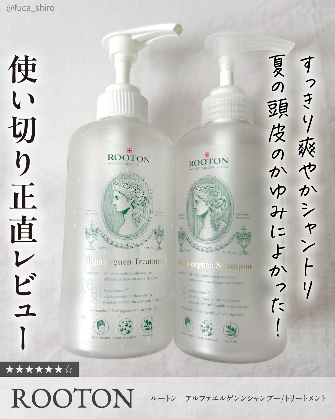 ROOTON【アルファエルゲン™シャンプー/トリートメント】500ml【PR】本投稿は商品を無償提供により作成致しました。今回紹介するのは、女性のために開発したトータルケア、ROOTON(ルートン)です⏬女性頭皮用抜毛シャンプー1位(韓国内)👑✨1.ルートンアルファエルゲンシャンプー500ml-Qoo10URL:https://www.qoo10.jp/g/1019404770-ヴィーガン成分や抜け毛緩和成分を配合した女性頭皮ピッタリのシャンプーです。韓国NAVERショッピングにて22.08-23.03女性頭皮用抜け毛シャンプーランキング1位、韓国内で妊婦用シャンプーで有名な商品です。2.アルファエルゲントリートメント500ml-Qoo10URL:https://www.qoo10.jp/g/1019404831-高濃縮クリームタイプの女性用抜け毛緩和トリートメントです。韓国の食役所報告完了した抜け毛緩和成分、アミノ酸型タンパク質を配合したヴィーガン商品です。✼••┈┈┈┈••✼••┈┈┈┈••✼感想まずこのオシャレなパッケージあと個人的に香りが好みでした!ハーブ系です!清涼感があるので今より夏におすすめですかね😅乾かした後サラサラ私に合ってるみたいです!抜け毛に効いてるのかは長期使用してみないとわかりませんが効果があれば嬉しいです少量でも泡立ちやすいです!普段2~3プッシュなので最初えらい目に合いました😅つけるすぎると今の季節はかなりスースーしますとにかく香りが好みで使う度癒されてます✼••┈┈┈┈••✼••┈┈┈┈••✼Qoo10JPにて購入できます!instagramアカウント↓@rooton.jp@rooton.official#ROOTON#ルートン#ヘアケア#シャンプー#トリートメント#韓国コスメ#韓国ヘアケア#角質ケア#頭皮ケア#アルファエルゲンシャンプ#qoo10#キューテン#qoo10メガ割#メガ割#qoo10韓国コスメ#韓国コスメ#目指せ毛穴レス肌#推せる春色コスメ紹介#好印象カラコン#至高のツヤ肌レシピ#自慢の溺愛デパコス#褒められメイクテク#自分映えヘアアレンジ#マグで煌めくネイル動画