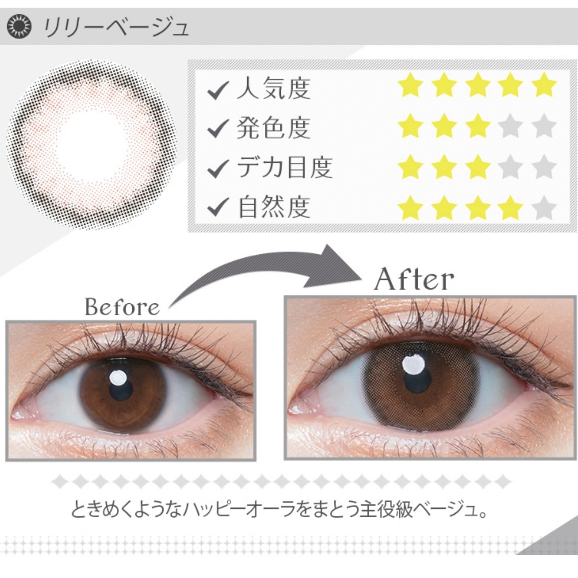 “Lily(リリー)”は英語で“ユリの花”という意味🌷ユリの花らしくふんわり儚げでありながらほんのりピンクの交じったベージュの色味で 🧸☁️ 𓂂𓏸 ナチュラルなのにパッと視線を惹きつける瞳に 💫´- 私は裸眼がほぼ黒目だから内側のカラーがわりとトーンアップするので若干ハーフっぽくもなる💭 雰囲気はガーリー系統に近いかも?王道のモテ × あざと 属性ですね 🫶🏻💘