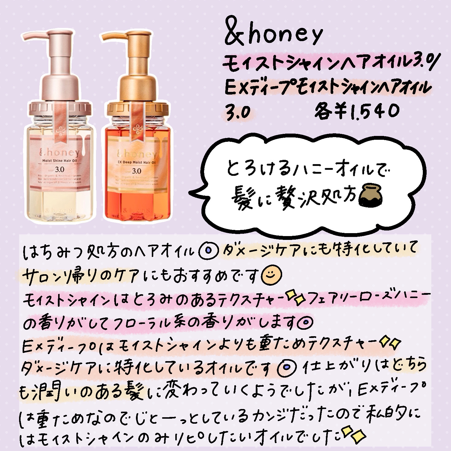 ほぼプチプラ!歴代使ったアウトバス用品/*BOTANISTボタニカルヘアオイルモイストさらっとしたベタつき感のないオイル熱ダメージのケアとしておすすめでヘアドライヤー・アイロンの前におすすめ◎香りもすごくよく、若干アップル強め🥰コスパや使用感がとてもいいんですが…ダメージが強く残る私の髪はどうしてもパサつきがめちゃくちゃ気になる仕上がりに…😭ダメージがそこまでない人にはすごくいいかも!*BOTANISTボタニカルヘアミルクモイストとろみのあるミルク🤔少し固めな感じがしました🐮潤いを髪に与えてくれるので、ヘアドライヤー後とかにかなりおすすめ◎翌朝、軽やかでさらさらな髪に変わっている気がしました!香りはボタニカルヘアオイルと同じ香り🌸オイルと合わせることで、さらに綺麗な髪になりそうです…!*N.N.ポリッシュオイルウェット髪にしやすいスタイリング保湿も与え、潤いのあるまとまりのあるヘアにもしてくれます🥺香りは柑橘系の香りが漂うので柑橘系が好きな人にはたまらないかも♡マルチオイルとして使えるのも!重ためのテクスチャーなので量を間違えるとじどーっとなりやすい…口が広いので、量を調整しにくい😭*ケラスターゼCHユイルクロノロジストR美髪にしてくれる最高級なオイル水に近いサラッとしたオイルなので馴染ませやすいのも良き◎使っていくうちに潤いをまとった髪にかわっていくようでした!プチプラでは無いので結構お値段はお高め😭*&honey&honeyMeltyモイストリペアヘアオイル3.0しっとりしたオイルべたつきも抑えてあり、かなり使いやすいです◎サロン帰りのケアとして使っています!フローラル系の香りが漂う香りです◎仕上がりは劇的にかわる、とかそんなんではなく、サロン帰りの髪質が少し長持ちするかな?なかんじです◎*&honeyCreamyEXダメージリペアヘアオイル3.0&honeyMeltyモイストリペアヘアオイル3.0より重ためのオイルダメージケアに特化しており、ダメージに悩む人におすすめです!おもためな分、じとーとした感じになったので、私的には軽めの&honeyMeltyモイストリペアヘアオイル3.0が使いやすいかな?ってなかんじです*WANOMIHAIRRECIPE和の実さらとろライスオイル潤いのあるまとまりのある髪質に変わってくれる感じでした!100%ピュア国産米ぬか使用でお米の香りがしそうですが、淡い柑橘系の香りが漂うので、柑橘系好きな人にはかなり好きかも♡マルチオイルなので全身にも使えます!重ためテクスチャーでかなりべたつきがあり、その手で容器を触ると悲惨なことに😭*LUXスーパーリッチシャインダメージリペアとろとろ補修ヘアクリーム軽やかで柔らかな髪質に変えてくれる感じでした🎶とろみのあるミルクのような柔らかいクリームで髪にしっかりと馴染んでくれます🎶ベタつかないのも嬉しいところ🎶*エッセンシャルザビューティウォータートリートメント水のトリートメント◎直接髪にかけれたりと、手軽に使えるのも魅力的✨仕上がりは髪をとかすとすごくまとまりのあるうるさらな髪に変えてくれる感じでした!髪を乾かす時間が早い気がするような?香りはウッド系の少し独特な香りがします◎私の母はその香りがどうしても苦手で中断しました😭・・<普段のケア〜ダメージが出始めるまで>・BOTANISTボタニカルヘアオイルモイスト・&honeyMeltyモイストリペアヘアオイル3.0・ケラスターゼCHユイルクロノロジストR・&honeyCreamyEXダメージリペアヘアオイル3.0<ダメージが出てからでも>・BOTANISTボタニカルヘアミルク・WANOMIHAIRRECIPE和の実さらとろライスオイル・LUXスーパーリッチシャインダメージリペアとろとろ補修ヘアクリーム・エッセンシャルザビューティウォータートリートメント<スタイリングとしても!>・N.N.ポリッシュオイル#BOTANIST#N.#ケラスターゼ#&honey#WANOMI#洗い流さないトリートメント#LUX#エッセンシャル#アウトバス用品#ヘアオイル#ヘアミルク#ヘアケア#アウトバス#プチプラ#比較レビュー#鹿の間ちゃんに届け