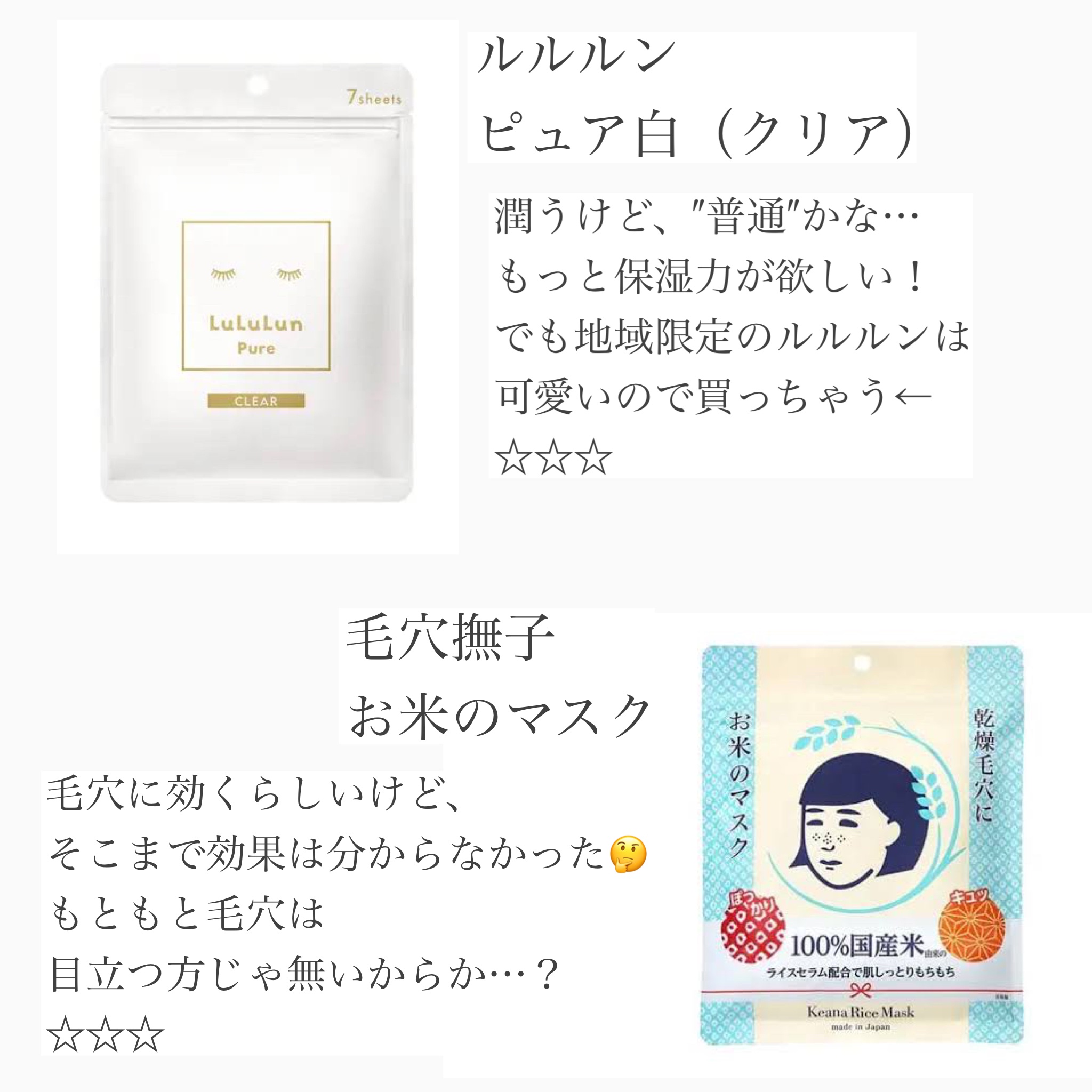 乾燥敏感肌が選ぶシートマスクレビュー💫♡リピ確おすすめ♡↓●ごめんね素肌マスクこれはリピしまくってるし、ストックも大量。これが無いと困るってくらい重宝してる!乾燥、ゆらぎ、赤みも全部解決。しかもコスパも良い💮液もたっぷり。●我的美麗日記 白真珠マスク大事な日の前はこれ!次の日絶対肌つやつやで化粧ノリ百点満点。しかも個装で衛生的。我的美麗日記は全部超良い最高‼️●透明白肌 ホワイトマスクN最近あんまり使ってないけど(ごめんね素肌のストックがありすぎるせいで)使ってた時期の写真見たら顔だけ白かった(多分ノーメイク)。また使いたいな〜微妙(普通)だったもの↓●ルルルンピュア白クリア乾燥肌には保湿力もっと欲しいかな〜毎日使いとかにはいいのかも?●毛穴撫子お米のマスク毛穴への効果は分からなかった(;;)保湿力はまあまあ!#クリアターン#ごめんね素肌#毛穴撫子#我的美麗日記#透明白肌#ルルルン#シートマスク#パックおすすめ