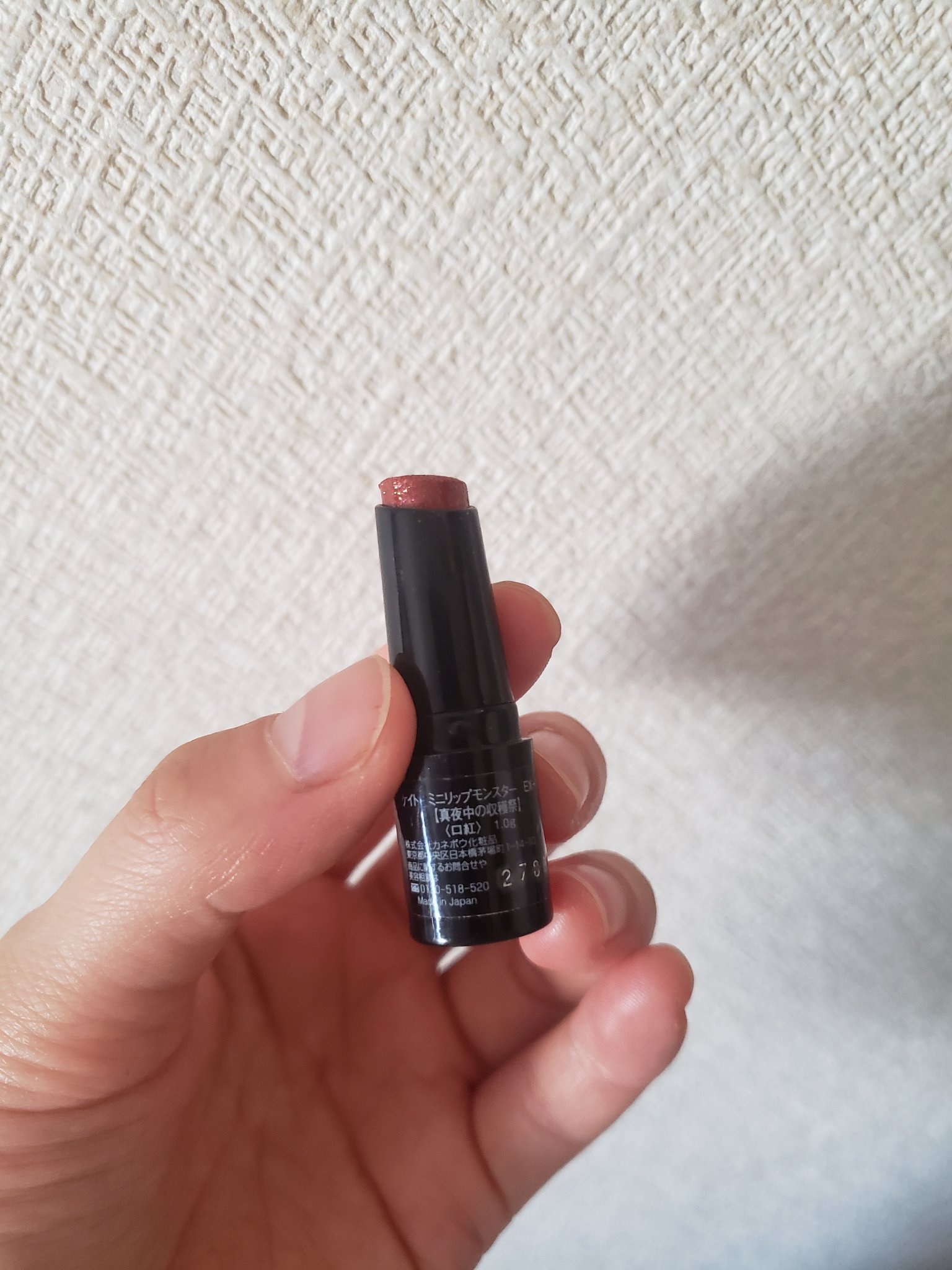 ラメ入りでキラキラしてて可愛い♡ ベースはシアーな発色で一度塗りだと色味がほぼニュアンス程度だから他のリップに重ねても可愛いかも! とろけるようにスルスルな塗り心地はモンスターリップと変わらずで嬉しい♡ ポーチインしやすいミニサイズでコロンとしてて可愛いです☺️