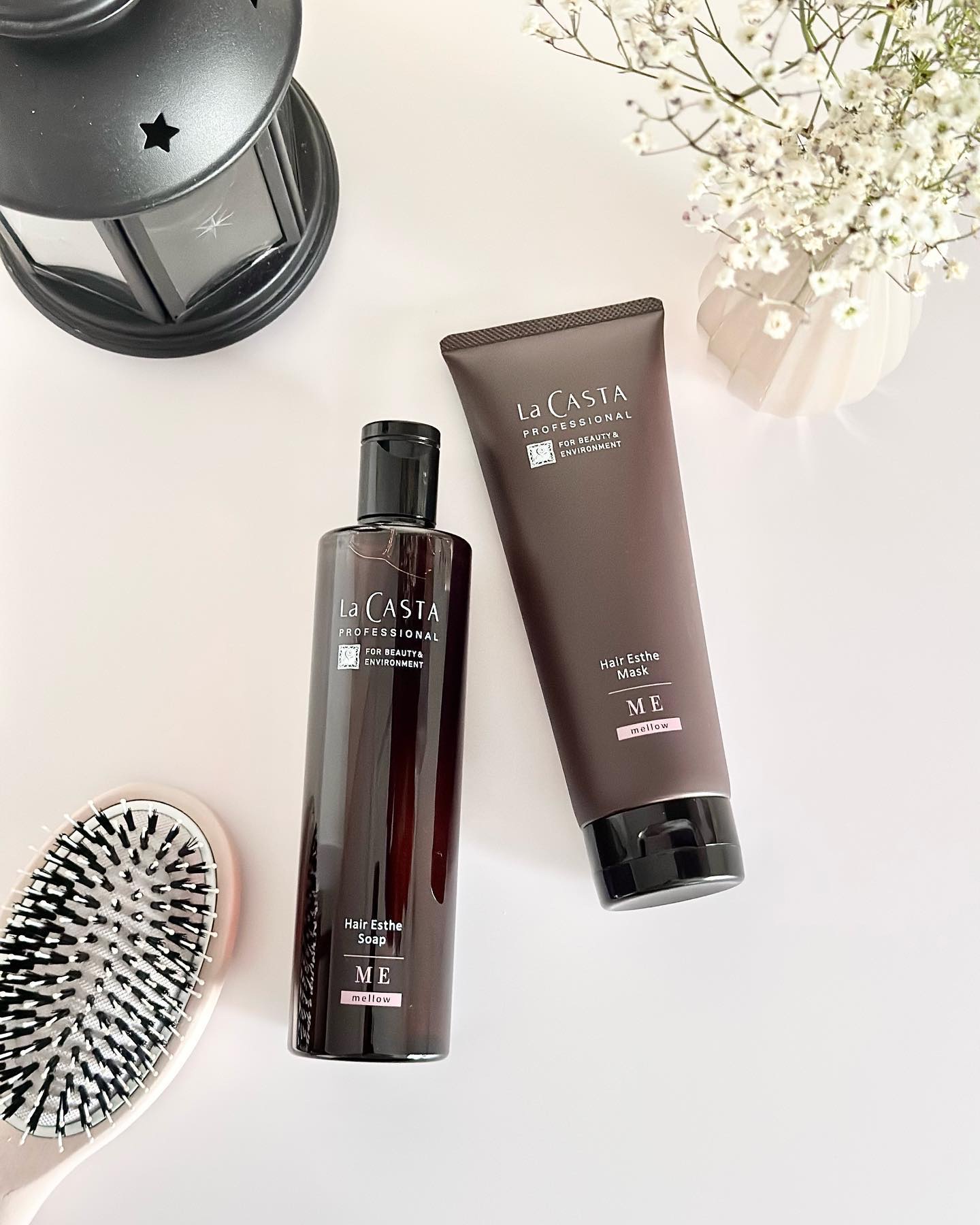 LaCASTA・ヘアエステソープME300ml¥2750・ヘアエステマスクME230g¥2750ーーーーーーーーーーーーーーーーーーーうねりなどのクセ毛やハイダメージ、硬毛・太毛タイプの人におすすめのヘアソープ&マスク🛁わたしはイヤリングカラー部分のハイダメージを含めて全体のパサツキがおさまり、髪の毛の指通りが良くなった実感がありました🕊泡立てる時にふわっとハーブ系の癒しの香りがしてリラックスできます🌿シャンプーはトロッとして泡立ちがよく流した後のきしみがありません。ポンプタイプだったらもう少しパパッと使えたかな〜とは思います💡マスクはクリーム色で伸びがよく、何より放置時間が2〜3分と短めで良いところがデイリー使いに嬉しい!わたしは季節の変わり目など、頭皮が少しかゆくなることがあるので、地肌にも優しいオーガニック植物成分でできているのが安心できました💎パッケージもおしゃれだしお風呂に置いていても生活感!な感じがしないのでいいなと思います🌱