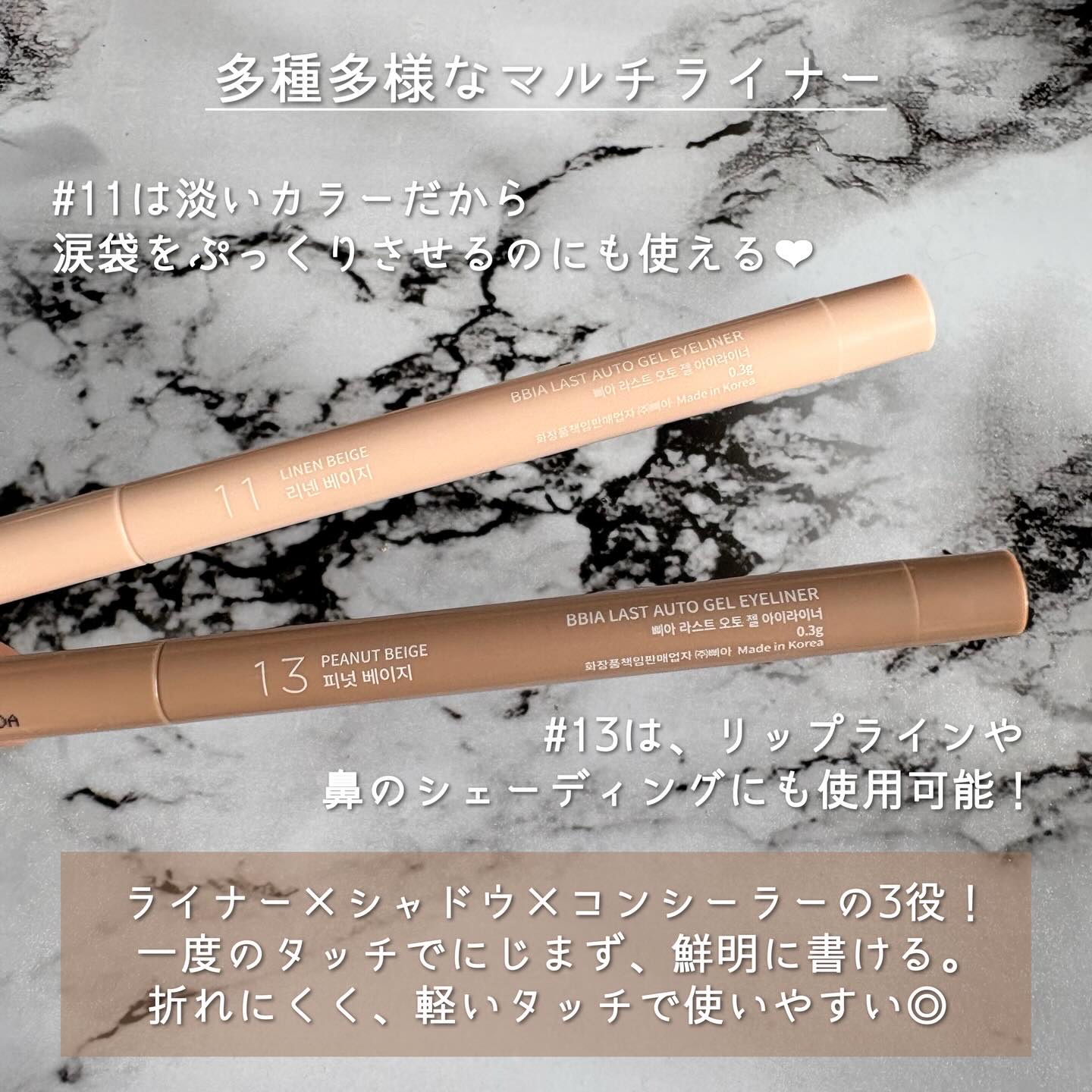 個人的に硬めに感じてしまい、 塗りにくさが若干ありましたが、 慣れると描きやすく、 ペンシルなのでしっかり定着してくれます。 11 リネンベージュはブルベ向き。 涙袋だけでなく、 眉毛の縁取りやコンシーラーとしてポイントで気になる部分のくすみを消したり、 唇周りに使うと口角を上げることが出来たりと 1本で何役も担ってくれるアイテムです😊💕
