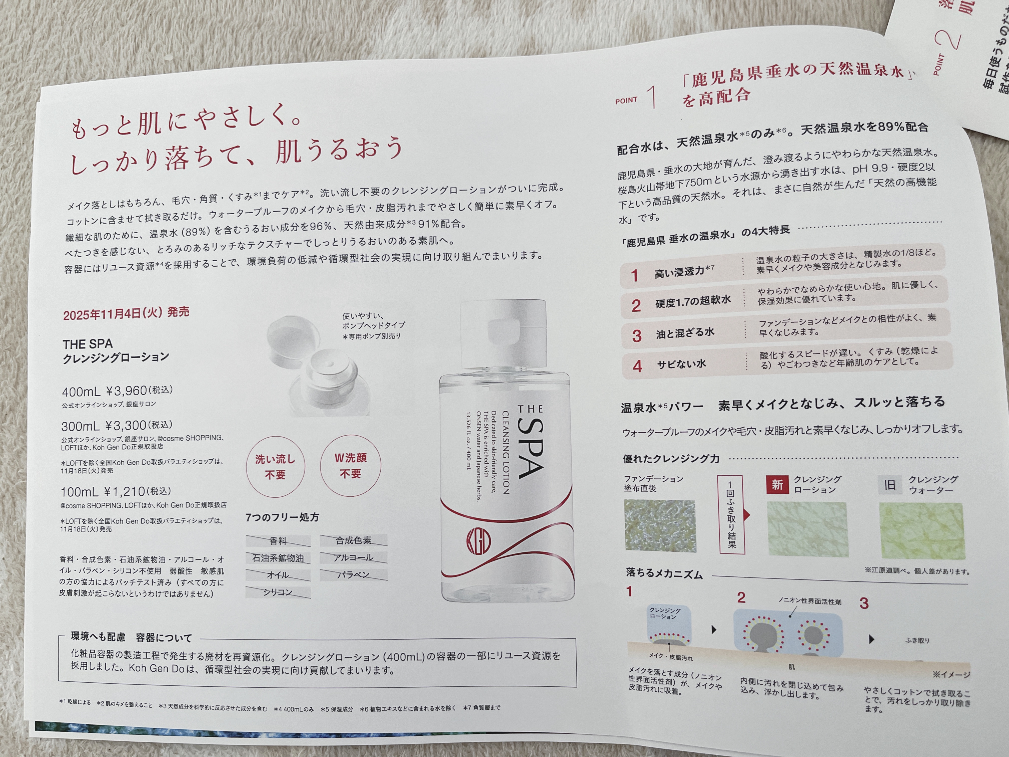 KohGenDoTheSPAクレンジングローション11月4日発売の新製品をプレゼントで頂きました🎁❤️既存でクレンジングウォーターもあるみたいですが、新発売のは白いパケです😀ちょうど朝用のふき取り洗顔が欲しくて探していたので、嬉しい⋆⸜(*॑꒳॑*)⸝私は朝メインで使用してます。ポンプに付け替えれば、更に時短で朝洗顔が完了!その後の化粧水の入りもいい感じ!とろみのある液は温泉水を89%使用しているとの事で、拭き取ったあとはかなりしっとりします。ベタベタでなくしっとりもっちり‼️更にこのトロミでコットンの摩擦を軽減してくれるようで、確かにスルスル拭き取れます。丁寧な説明プリントも同封されており、余計なものは入れずに、肌にいい成分は色々はいっていたり、摩擦負担無くすテクスチャにしていたりと、信頼おける商品だというのが分かります📖´-夜はポイントリムーバーとクレンジングバーム派なのですが、帰宅後忙しい中でもパパっと軽くベースメイク落とせるのがとても便利✨軽いメイクとかならコレ1本でメイク落としと洗顔が完了するので、風呂入る気力も無いときとか飛行機の機中泊とかにもピッタリだな、と思います👍400㎖とかなり大容量なので、摩擦軽減のため、ケチらずたっぷり使えるのも嬉しいです💖サイズは400㎖300㎖100㎖の他にクレンジングシートが発売されるみたいです✋今人気のSISIを買おうか迷ってたんだけど、KohGenDoのほうが容量同じで値段半分でコスパ良し🤔成分も良さそうだし、2層式じゃないから振らなくていいのとポンプで片手で出来ちゃうのでタイパ最強🙌#クレンジングウォーター#タイパ#コスパ#朝洗顔