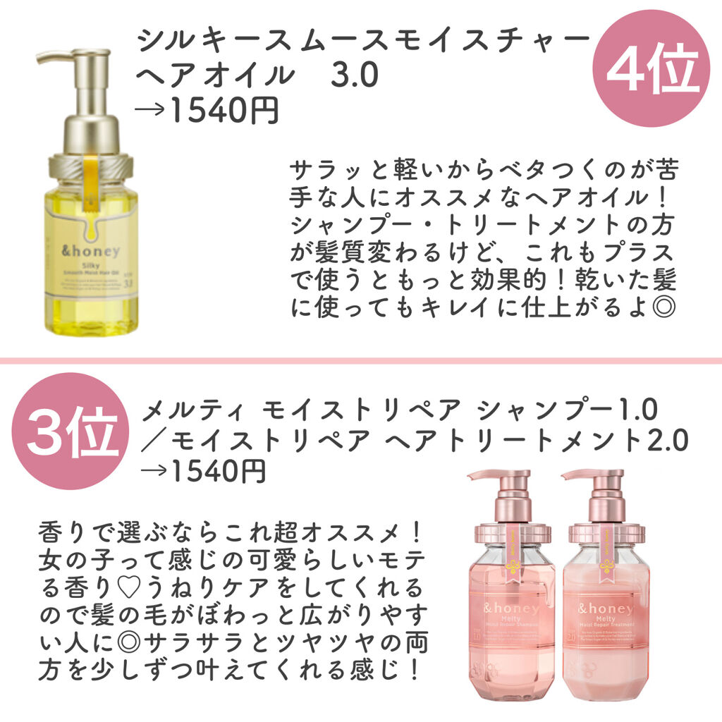 【完全版】\大人気アンドハニーまとめ/とぅるんとぅるんな潤い髪になれる✨こんにちは!アフリカ少女です🐘(インスタもフォローしてくださっている方はフォロバするので、コメントで教えてください❤︎)今回は、大人気アンドハニーの、シャンプー/トリートメント、ヘアオイルなどをランキング形式でご紹介!10位✔️ボディ&ヘアオイルカプセル3.5→1540円エリップスみたいなカプセルタイプ!割と軽めなテクスチャーなので万人受けなオイルだと思う!髪が短いとちょっと量が多くてもったいないかもだけど、肌にも使えるから余ったらマッサージにも◎9位✔️サクラディープモイストシャンプー1.0/ヘアトリートメント2.0→1540円アンドハニー好きなら絶対ゲットしたい、期間限定の香り!桜もちっぽい感じの甘めな香りで、春を感じられるよ♡しっとり髪の毛を潤してくれるから、もちろんシャンプーの効果的にも最高!8位✔️EXディープモイストヘアオイル3.0→1540円他のヘアオイルよりもさらにしっとりしてて、とにかくパサパサ髪で広がりやすい人にオススメ!つけすぎるとちょっとベタつきが気になるので、使うときは量の調節には気をつけてね!7位✔️マトメイクスティック4.0→1078円太めのマスカラみたいな形で、アホ毛をなでつけると完璧にアホ毛が消える!全くベタつきがなくて濡れた感じにもならないので、前髪をこれでまとめるのも良さそう◎甘めな香り付きで気分上がる!6位✔️ディープモイストヘアオイル3.0→1540円ちょっと重ためなテクスチャーのヘアオイル!お風呂上がりに濡れた髪につけてドライヤーで乾かすと、次の日の朝の髪のまとまりが全然違う!乾いた髪にはあんまりオススメしない!5位✔️ディープモイストヘアパック1.5→1100円このパックをシャンプーの後にたっぷり塗って、そのまま流さずにトリートメントを使うと、めっちゃ潤いたっぷりになる!究極のとぅるっとぅるな髪になりたい人はこれ足してみて!!4位✔️シルキー スムースモイスチャー ヘアオイル 3.0→1540円サラッと軽いからベタつくのが苦手な人にオススメなヘアオイル!シャンプー・トリートメントの方が髪質変わるけど、これもプラスで使うともっと効果的!乾いた髪に使ってもキレイに仕上がるよ◎🥉3位✔️メルティモイストリペアシャンプー1.0/モイストリペアヘアトリートメント2.0→1540円香りで選ぶならこれ超オススメ!女の子って感じの可愛らしいモテる香り♡うねりケアをしてくれるので髪の毛がぼわっと広がりやすい人に◎サラサラとツヤツヤの両方を少しずつ叶えてくれる感じ!🥈2位✔️ディープモイストシャンプー1.0/ヘアトリートメント2.0→1540円割と重ためのテクスチャーで、とにかくしっとりさせてくれるタイプ!髪の毛の乾燥やダメージがひどい人に◎私は全然気にならなかったけど、ちょっと香りが強めなので苦手な人もいるかも…!🥇1位✔️シルキー スムースモイスチャー シャンプー 1.0/ヘアトリートメント 2.0→1540円するんと指通りの良い、サラッサラな髪の毛にしてくれるタイプ!細くて絡まりやすい髪の毛の人にも、硬くてゴワゴワしがちな人にもオススメ◎重たすぎないから髪がペタってすることもないよ!「こんなランキングが知りたい!」といったご意見がありましたら、コメントでどしどしお待ちしております🙌💕なかなかコメント見れてないので、質問はインスタの方にお願いします🙇♀️💕*:.,.:*:.,.:*:.,.:*:.,.:*:.,.:*:.,.:*:.,.:*:.,.:*:.,.:*:.,.:*:.,.:*最後まで見てくれてありがとうございました〜🥰《Instagram》インスタも良かったらフォローお願いします♪@africa_onnanokoです🐘共感した!参考になった!面白かった!という方は、いいね❤️、クリップ📎、フォロー👤、お願いします☺️#プチプラコスメ#プチプラメイク#透明感コスメ#透明感メイク#儚げコスメ#儚げメイク#スクールメイク#モテメイク#モテコスメ#ピンクメイク#ピンクコスメ#ナチュラルメイク#中学生#高校生#小学生#大学生#新作コスメ#限定コスメ