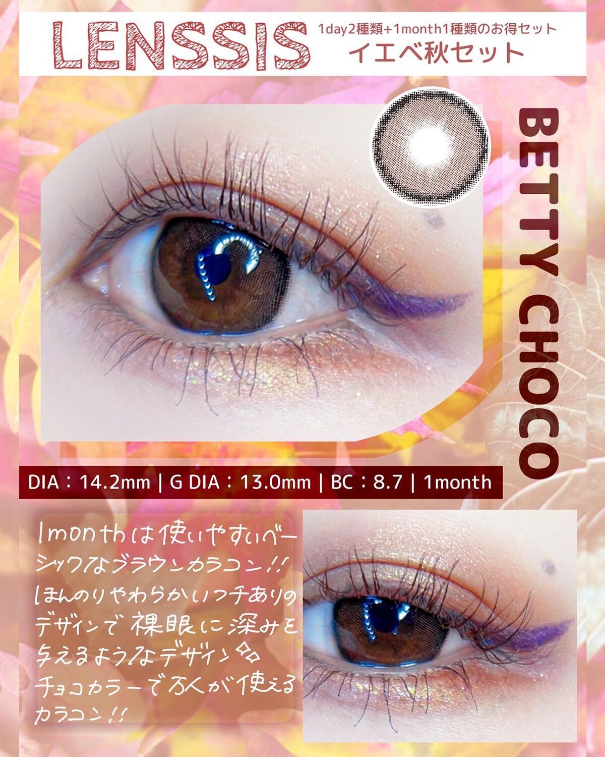 このイエベ秋セットはどれも肌に馴染む色合いで普段使いに最適だなと思いました🙌❤️ 着色直径小さめで使いやすいし派手になりづらいのですがそれぞれ色味やデザインが違ってて可愛らしいのでその日の気分に合わせて選べるのが良い🥳 ワンデーのサンドベージュ/ウィサムライトチョコ 1monthのベティーチョコの3種類が入ったセットになっていて、LENSSIS公式サイトでは通常7200円☞5000円にセール中👀