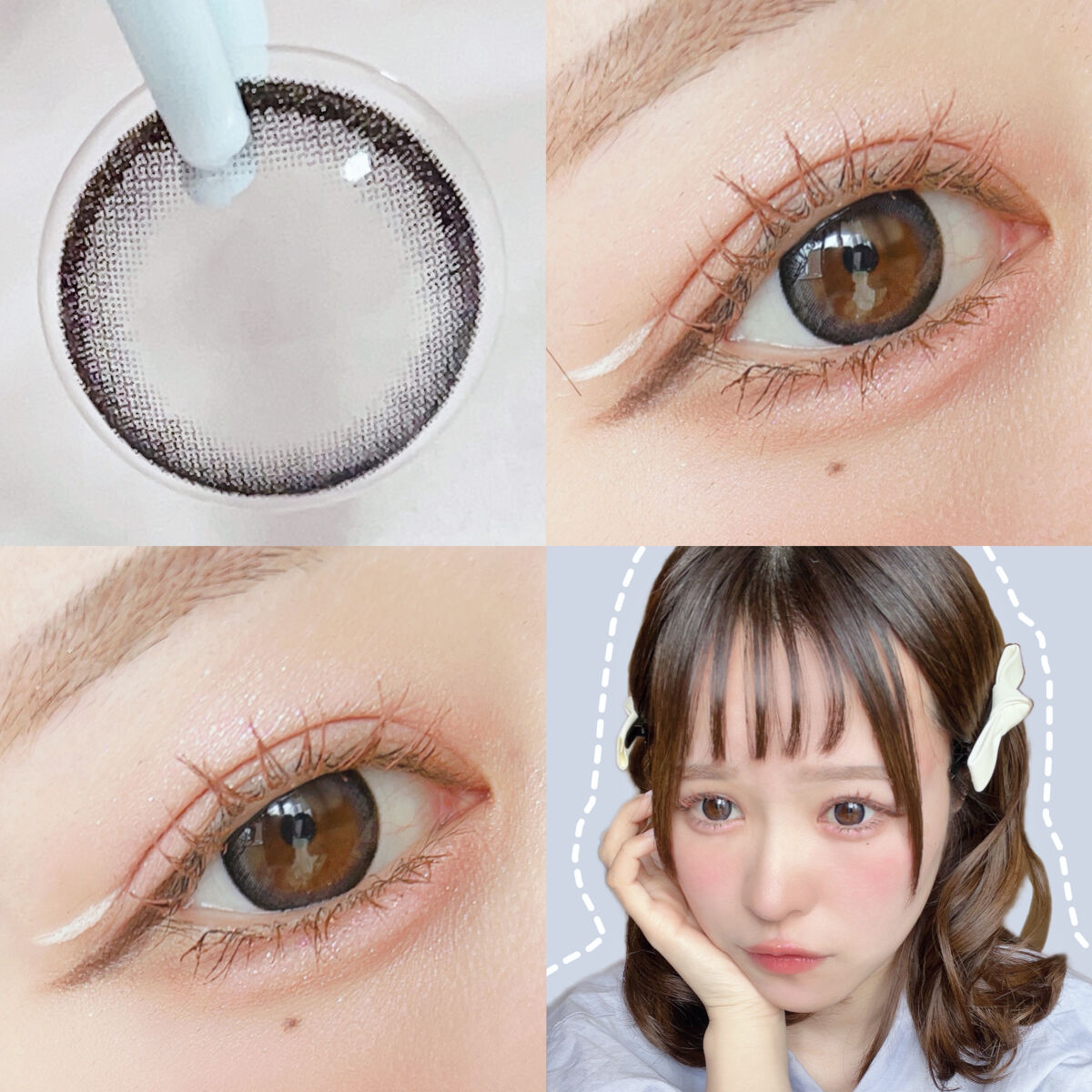 子猫のような透き通った青い瞳が手に入るレンズ♡ グレーみたっぷりカラーなのに派手に見えず大人な可愛さがあります♡ 外国の赤ちゃんのようなピュアな瞳が手に入るレンズ♡太めの黒フチでくりくりっとした幼い目元に仕上がります♡ 外を眺める猫のような瞳が手に入るビー玉レンズ♡つけると元の瞳の色が透けて幻想的な色味に変化します♡