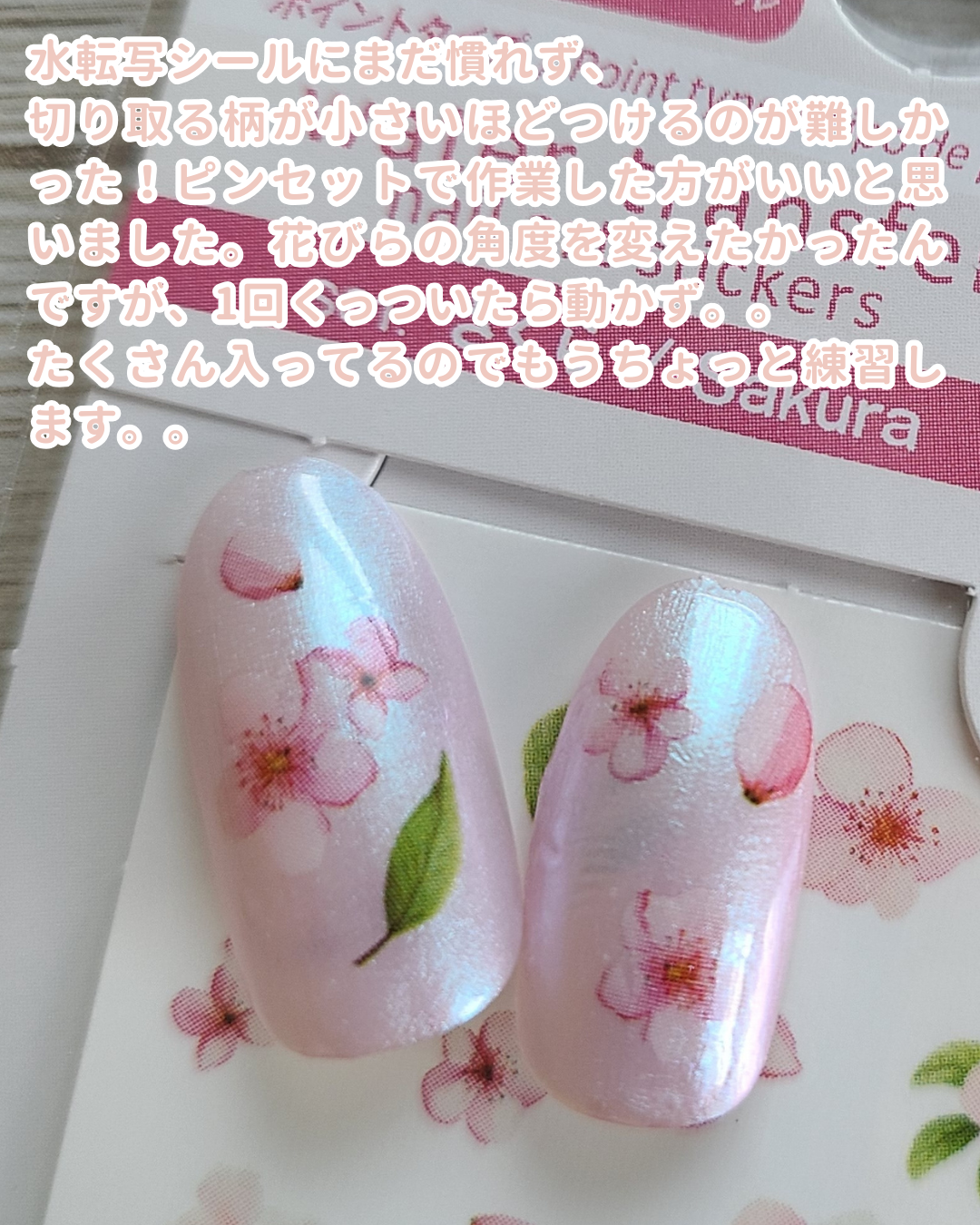 【ダイソーのさくら柄ネイルシールを使ってみた】ベースのネイルカラーは淡いピンク系のパールカラーのエレガンスラズルエナメルラッカー39番をしっかり3度塗り。上にダイソー水転写ネイルシールを貼りました。使いたい柄をカットして水につけて貼り付けるタ...