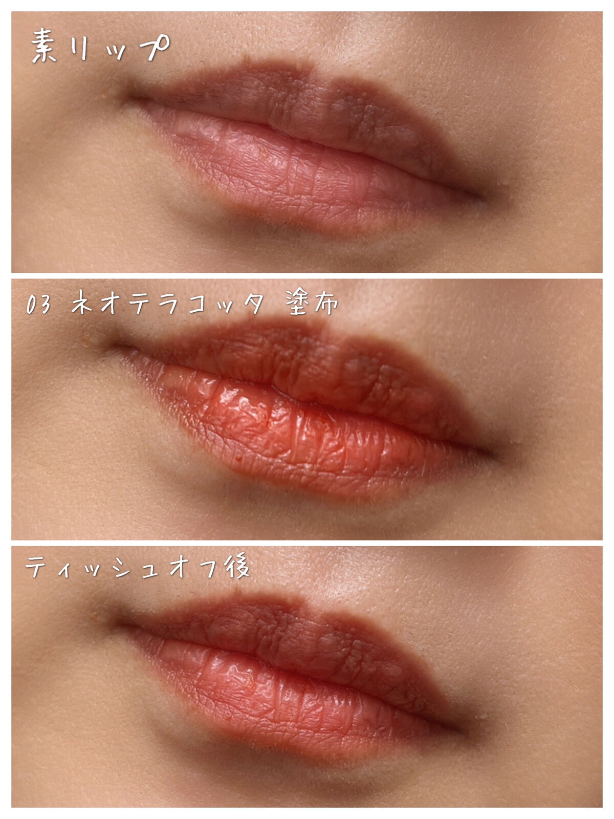 みずみずしい薄膜。発色も一番透ける!🫥 こっちは打って変わってむっちり感のあるグロスで、重ねると厚みが出せるタイプ。 美しい発色はもちろん、オイルのちゅるんとしたツヤも驚くほど長持ち。 発色もオイルのちゅるんと感も、色もちもJILLと同等。 バームのなめらかな保護膜感、透けるけど高発色。おまけにほんのりプランプ効果。