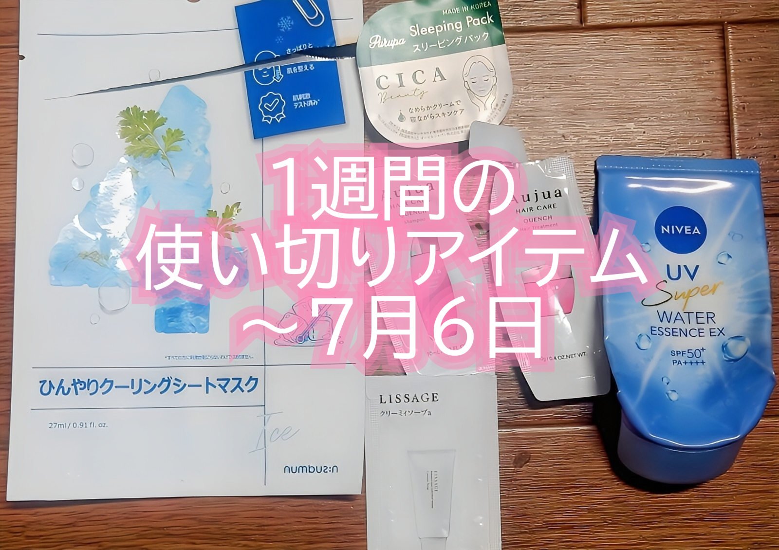 【1週間の使い切りアイテム】無くなるときは一気に無くなるけど、無くならない時はホント無くならない使い切り…笑●numbuzin4番ひんやりクーリングシートマスク→ひんやり感が夏にもってこい!かなり好き。●セリアプルパ シカスリーピングパック→安いけど使用感が好きなので使いやすい。●ニベアニベアUVウォーターエッセンスEX→安いけどこれまた使用感が好みでした!ボディと顔面の両方いけるのが楽で良き。◯ミルボンAUJUAトライアルキット→Aujua使うと使用感の良さにビビる…◯リサージエクストラクリーミィソープ→サンプル頂いたので。使用感はしっとりつっぱり感じにくい。#使い切りアイテム #1週間の使い切り