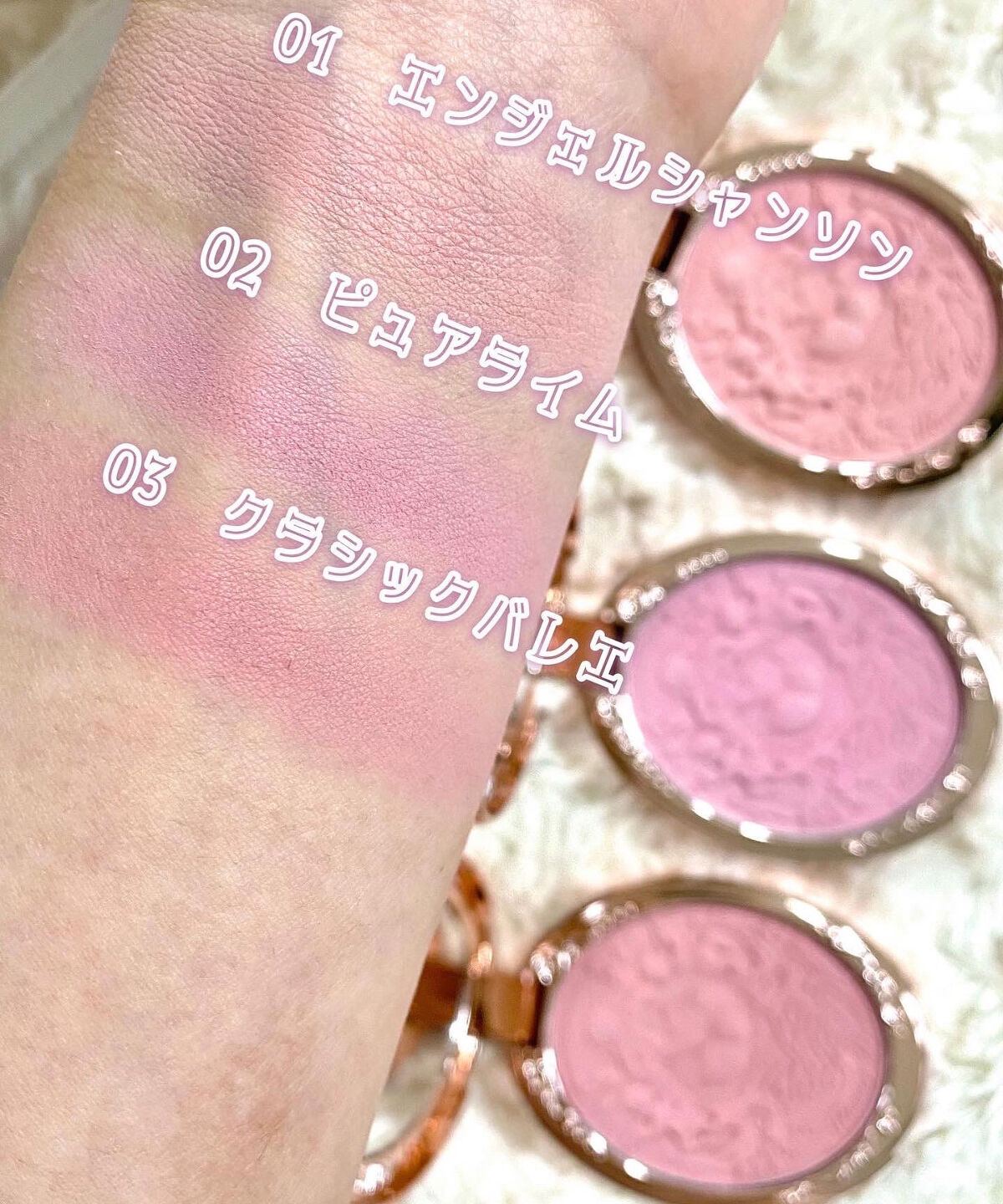メインはいちごのようですが、輝く貝殻や天使、リボンモチーフなども散りばめられ独特の世界観が広がります。まるで美術館の展示品にいちごを掛け合わせたような…。 01~03はブラウン系でとっても使いやすそうなのですが、ここはあえてかわいさ重視で04シャンミスティローズと05クリーミーマカロンにいっちゃいました🍰 リップは種類が多すぎてホントに悩む〜💦 水色容器の01~03は青みピンクベージュ、桃色容器の04~06はややブラウンなピンクベージュ、赤色容器の07~09は赤リップ❤️って感じでした。 チークブラッシュは蓋部分の装飾の奥行きがすごくてずっと光に当てたりしながらずっと眺めていられます。ビンテージの宝石ブローチがモチーフになったそう。