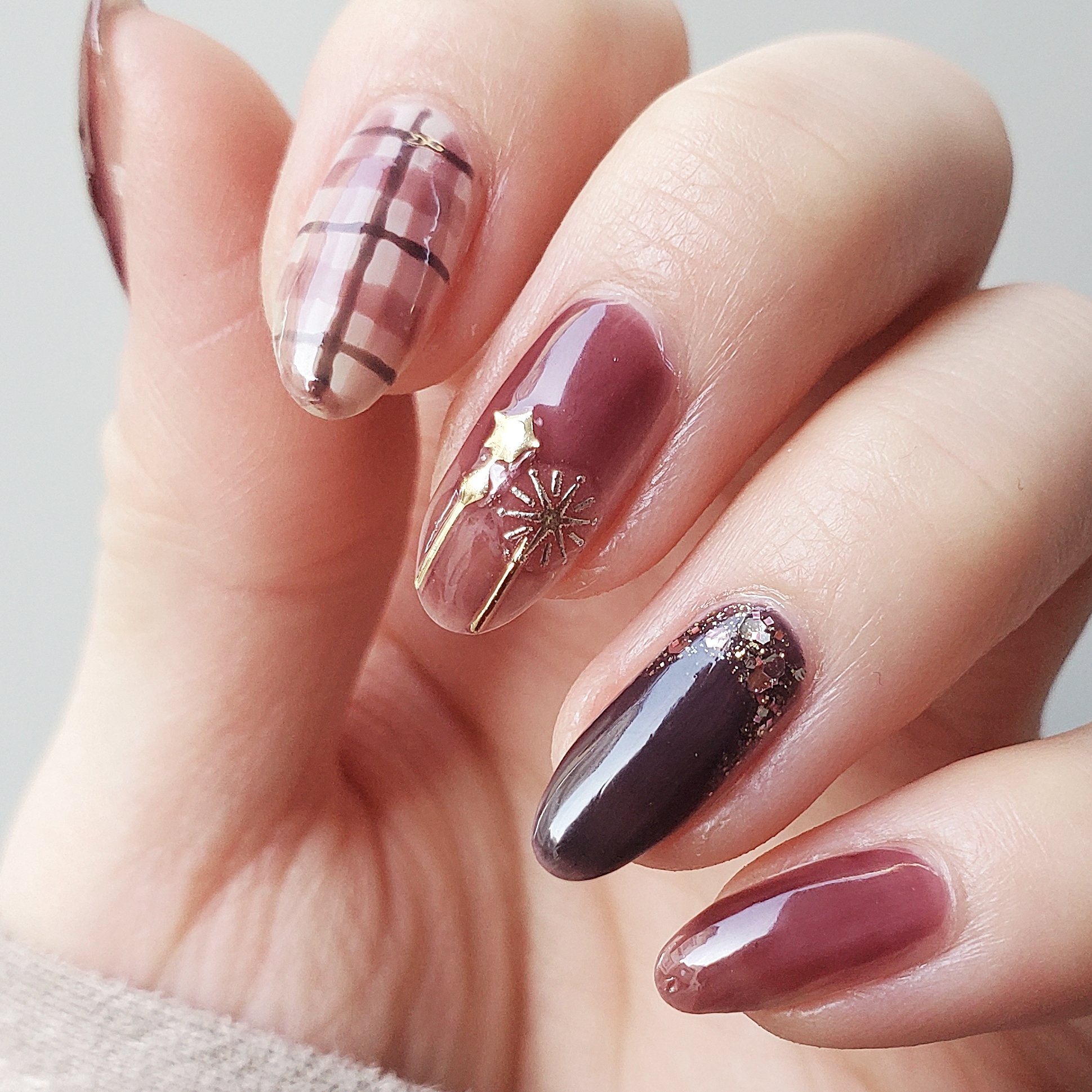#クリスマスネイル のシーズン 🤍✨ チェック柄を練習中なので、チェック × オーナメントのネイルを💅 Xのフォロワー様から教えて頂いたエレガンス ラズルの65Lens ghost roseがめちゃくちゃに可愛すぎて最近愛用中🫶🏻 大好きなパラドゥのポリッシュに似てて感動しちゃいました…!