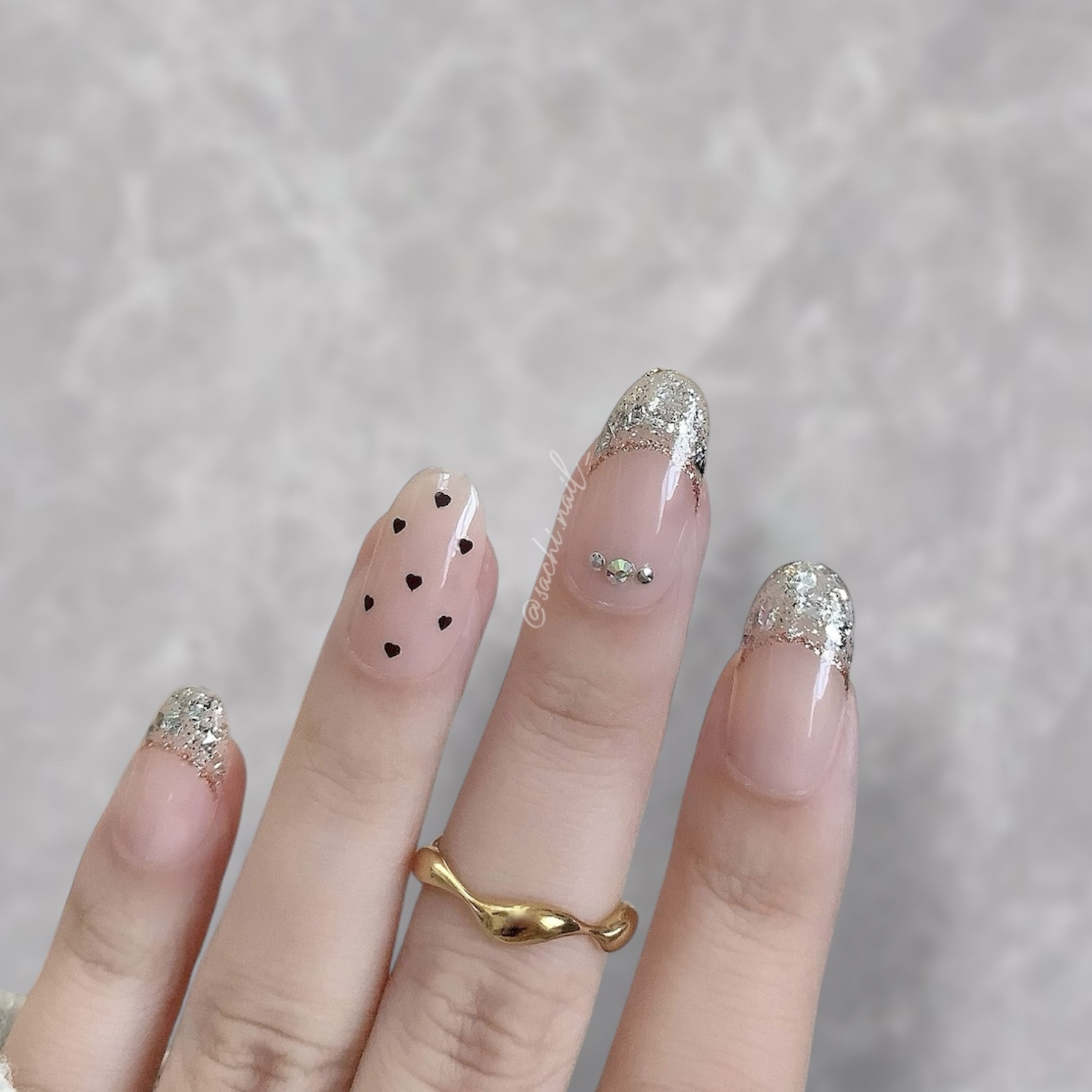 ホロじゃないから厚みが出ない😍!箔でつくるキラキラガラスフレンチ💅Howtoは3枚目に😘薬指は614番を2度塗りしてハートのホログラムをドット風につけました✨少しでも参考になれば嬉しいです♥️#セルフネイル#ポリッシュ#マニキュア#ネイル#フ...