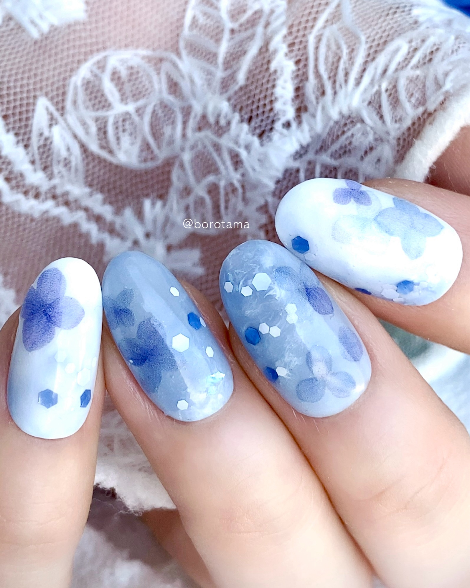 100均シールで簡単!紫陽花ネイル💐Seriaのシールを使った紫陽花ネイル!前回と色違いで作ってみました🩵このシーズンDAISOなどでも紫陽花シール売ってるのでどれを使おうか迷いますね!********************♡使ったもの♡♡#NAILHOLIC(#ネイルホリック)330円(税込)#ネイルホリックBL934♡#Seria(#セリア)各110円(税込)・フィックスグロッシートップコート・白色のマニキュア・ネイルシール紫陽花JAN:4968583222225♡#PLANETNAIL(#プラネットネイル)880円(税込)#ネイルポリッシュPLAD(26天飛ぶ光の羽衣)********************♡作り方♡作り方は画像を参考に📷①白色を好みにあわせて2度塗りしておく※すぐに使うので写真の2本をあけておく②ホロのカラーをのせる③境目をトップコートでぼかしよく乾かす💡混ぜすぎると色が薄くなってしまうので境目を軽くぼかす程度で○💡薄い場合は②~③を繰り返す⚠乾いてないとシールを貼るときにヨレるので注意!④シールを貼り付けて⑤トップコートを塗れば完成✦※トップコートは2度塗りがオススメ********************シールが薄いので台紙から剥がす際はくっつかないように注意してください~水色とピンクどっちが好きですか??簡単でオススメのデザインなので試してみてくださいね!#ネイル#セルフネイル#プチプラネイル#梅雨ネイル#紫陽花ネイル#夏ネイル#簡単ネイル#セルフネイル初心者#ポリッシュ派