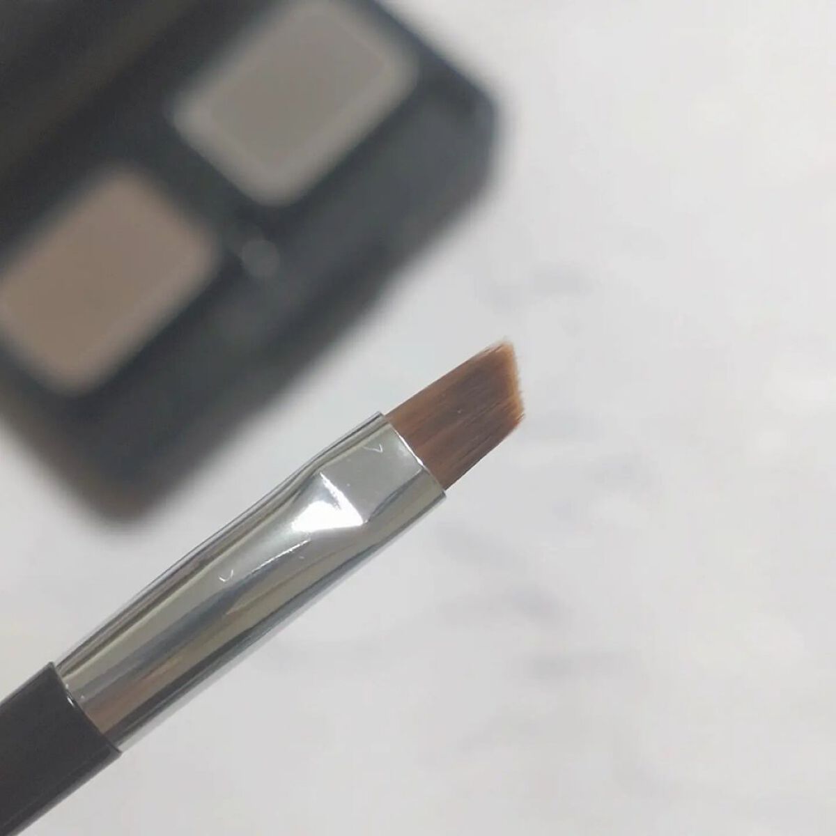 保湿成分や抗炎症成分も配合されていてお肌への優しさも考えられています 粉質はしっとりしていて発色はやや淡め 付属のブラシは斜めカットで細かい描き込みに向いています ピタッと密着して擦れに強いと感じました 右のグレーの色は黒髪さんでしっかり描きたい人向けで、左のダークブラウンは暗めの髪色でなおかつ柔らかな印象の眉に仕上げたい人にいいかなと思います