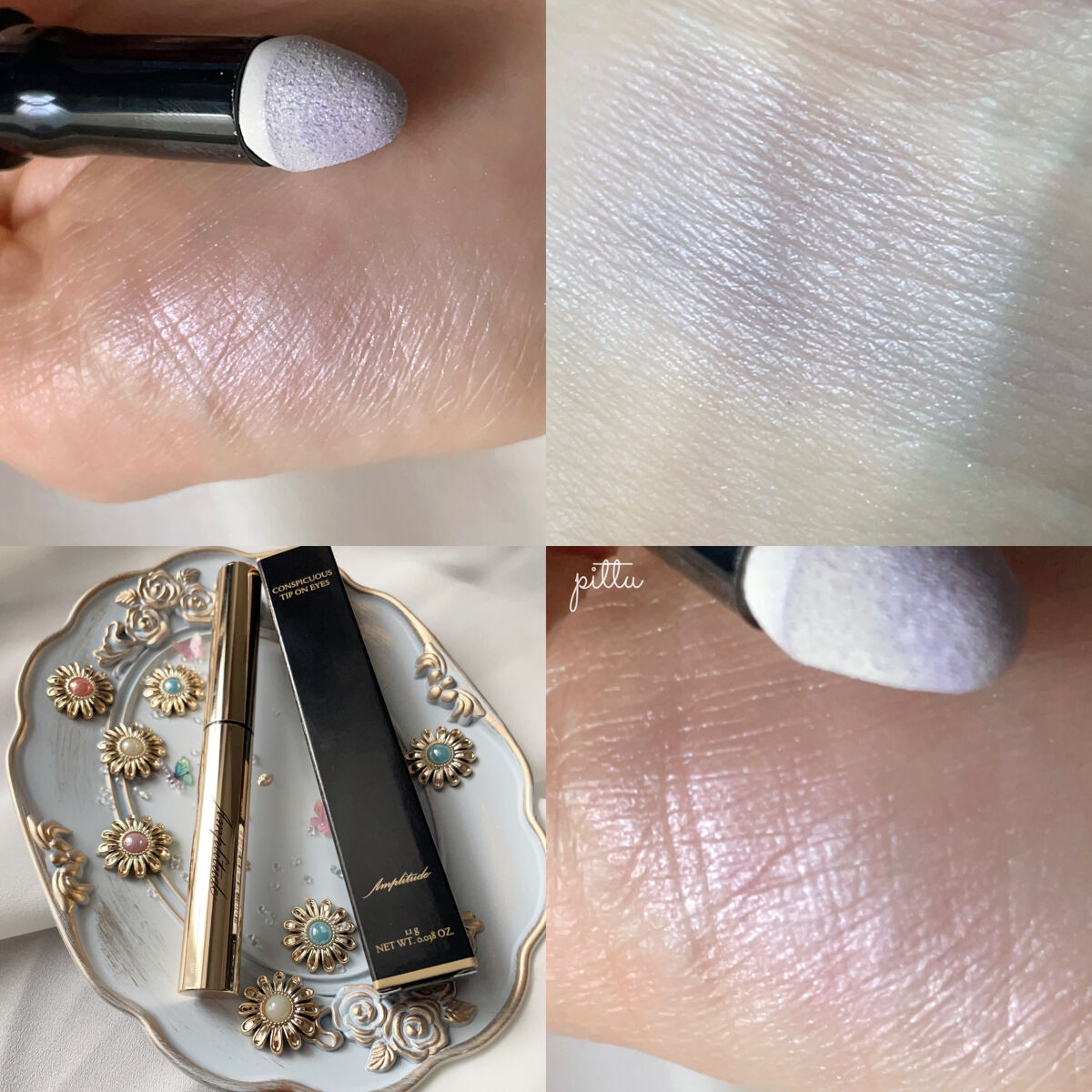 #Amplitude#コンスピキュアスチップオンアイズEX-03#ソフトバイオレット3,520円ライラックのような青みを感じるバイオレット。アンプリらしく上品なラメ・パール感で洗練された発色。サッとひと塗りでも綺麗な仕上がります!塗った後、指やブラシでぼかすとあわいカラーになり透明感が出ます!強い力でまぶたに塗らなくても、なめらかにスッーと塗れてまぶたへにも優しい刺激。チップはまぶたに塗りやすいよう細くないので、ラインのように細い線を描くのは向いていないかも。ただチップの形は涙袋にも使いやすいと思います。5色限定で発売されたけど、他4色はもっと使いやすいカラーだと思います!とくにベージュピンクや、ブラウンはオフィスメイクにもおすすめです。