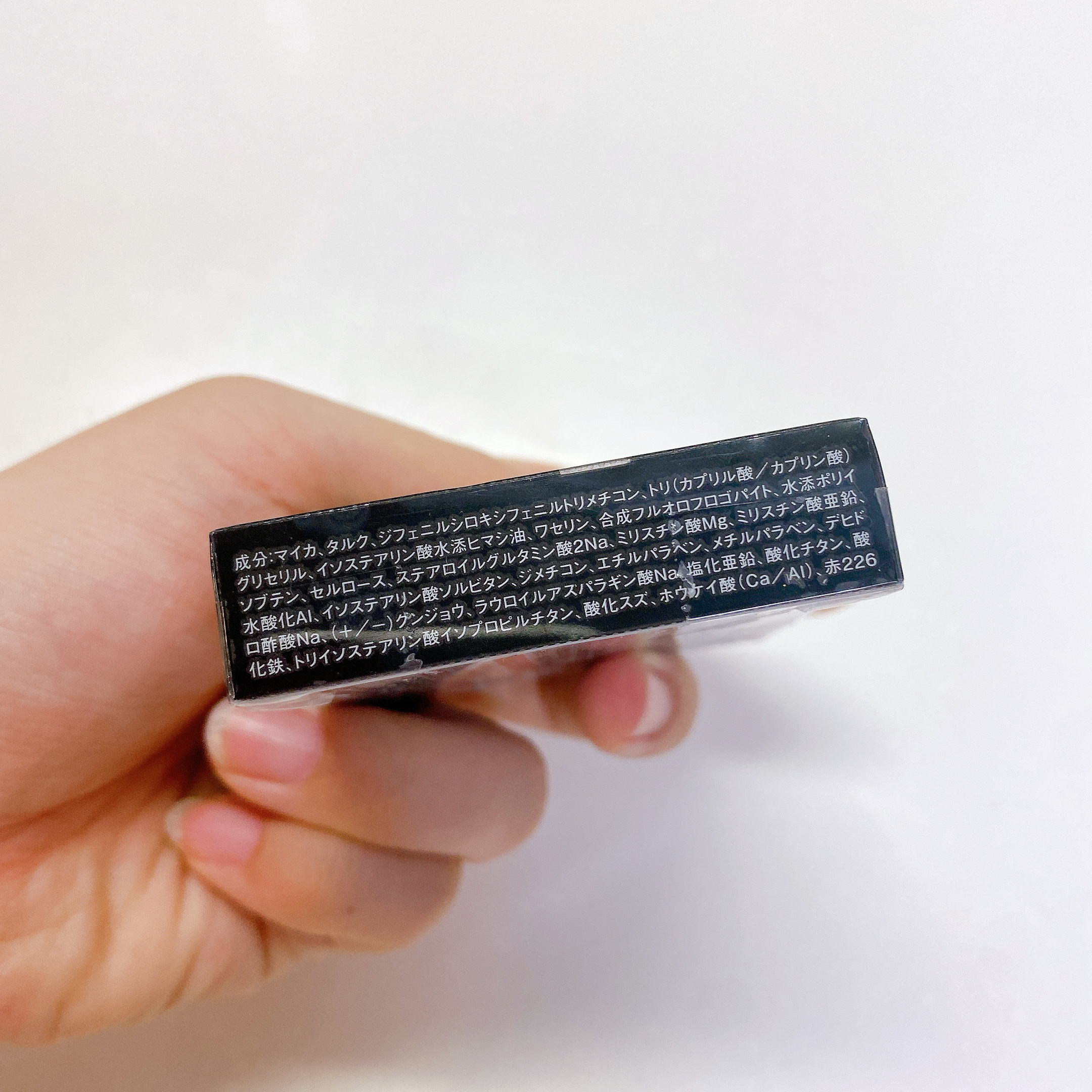 - マイカ、タルク、ジフェニルシロキシフェニルトリメチコン、トリ(カプリル酸/カプリン酸)グリセリル、イソステアリン酸水添ヒマシ油、ワセリン、合成フルオロフロゴパイト、水添ポリイソブテン、セルロース、ステアロイルグルタミン酸2Na、ミリスチン酸Mg、ミリスチン酸亜鉛、水酸化Al、イソステアリン酸ソルビタン、ジメチコン、エチルパラベン、メチルパラベン、デヒドロ酢酸Na、(+/-)グンジョウ、ラウロイルアスパラギン酸Na、塩化亜鉛、酸化チタン、酸化鉄、トリイソステアリン酸イソプロピルチタン、酸化スズ、ホウケイ酸(Ca/Al)、赤226