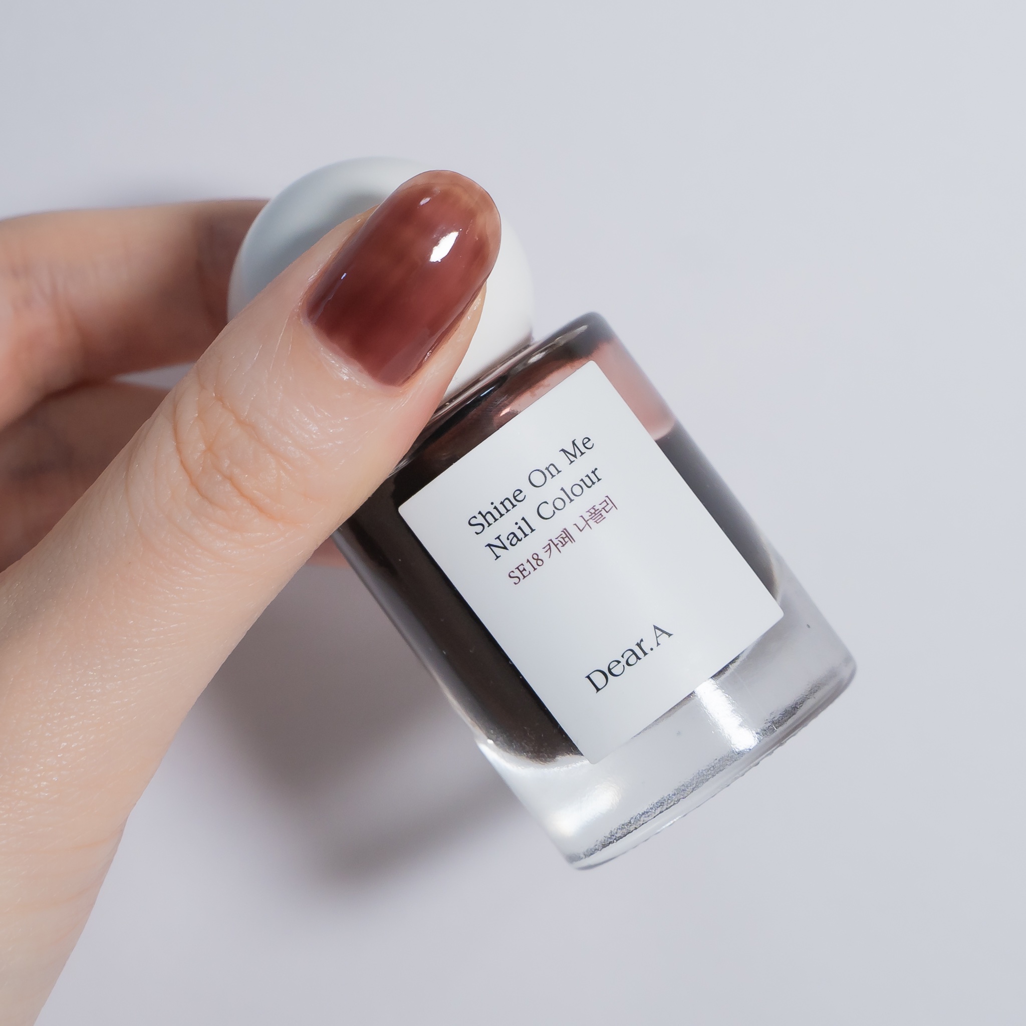 Dear.AシャインオンミーネイルカラーSE18.CaféNapoli¥990*手持ちは旧パケですSE18.CaféNapoliは大人なコーヒーブラウンです☕️透け感が強く、画像は3度塗りでしっかり色を出していますが、透け感も感じる仕上がりになっています。シアーな分少しムラになりやすいですが、3度塗りするとムラはなくなります。#Qoo10メガ割