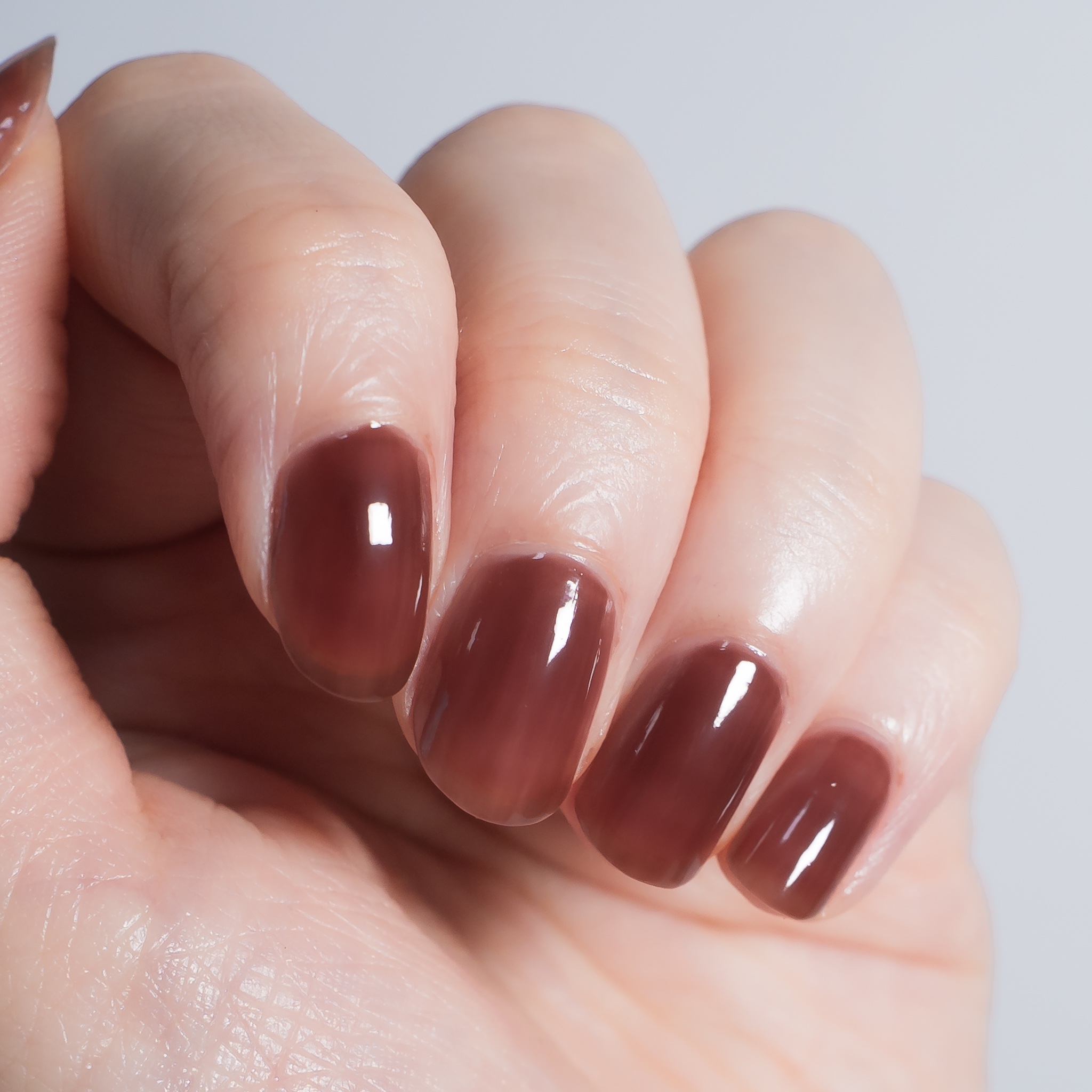 トップコートなしでも、ちゅるん♡ 透け感のあるブラウンカラーがおしゃれ🤎 1度塗り、2度塗り、3度塗りで 塗り比べしたのですが シャインオンミーネイルカラーの中でも 特に透明感を感じやすいカラーだと思います♩ 何度塗りかによってかなり色が変わるので 自分の好みに合わせやすいです🤍