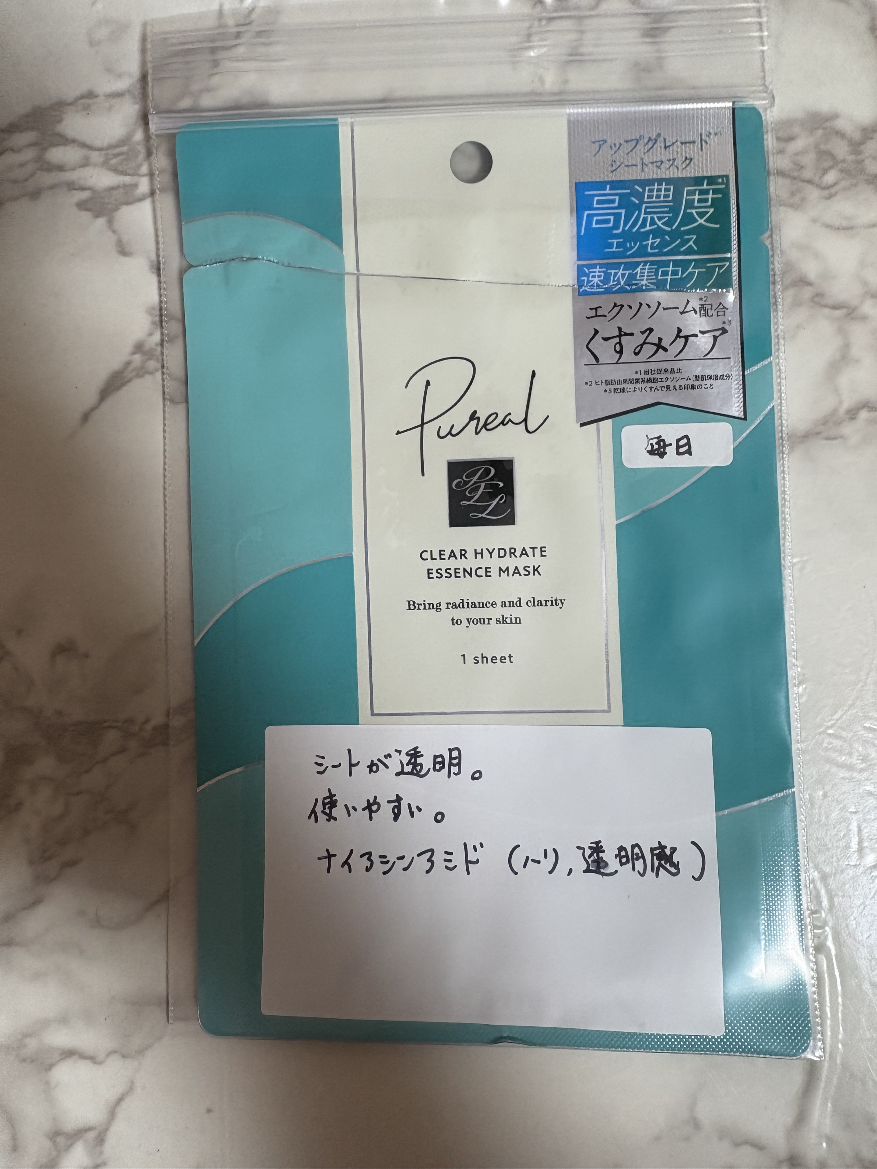 ピュレアのクリアエッセンスマスク7枚¥660です。エクソソーム(整肌保温成分)ヒト幹細胞培養液(保湿成分)、ガラクトミセス培養液(整肌保温成分)、ナイアシンアミド(整肌成分)が入っています。とにかく肌を整えてくれるんだな、という印象です。やはりシートマスクが透明で、使いやすい厚さです。ハリや透明感に期待できるのかなと思いました。また買いたいです。