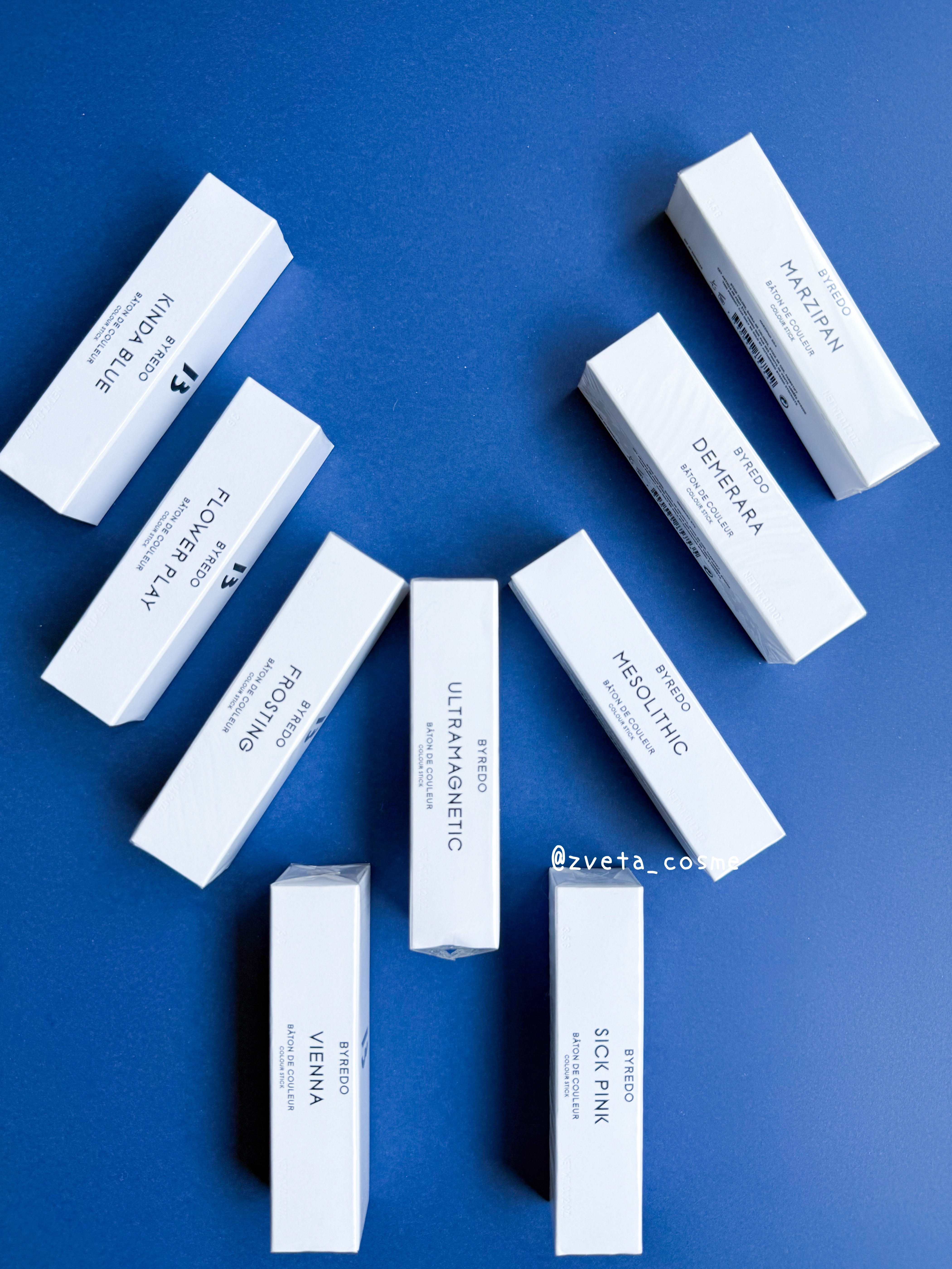 BYREDOカラースティック¥4,840上(左▶︎右)フラワープレイデメララヴィエナ中シックピンクメゾリシックマジパン下カインダブルーウルトラマグネティックフロスティング#デパコス#衝動買いコスメ#海外コスメ#メイク#濡れツヤアイシャドウ#アイメイク#モカムースメイク
