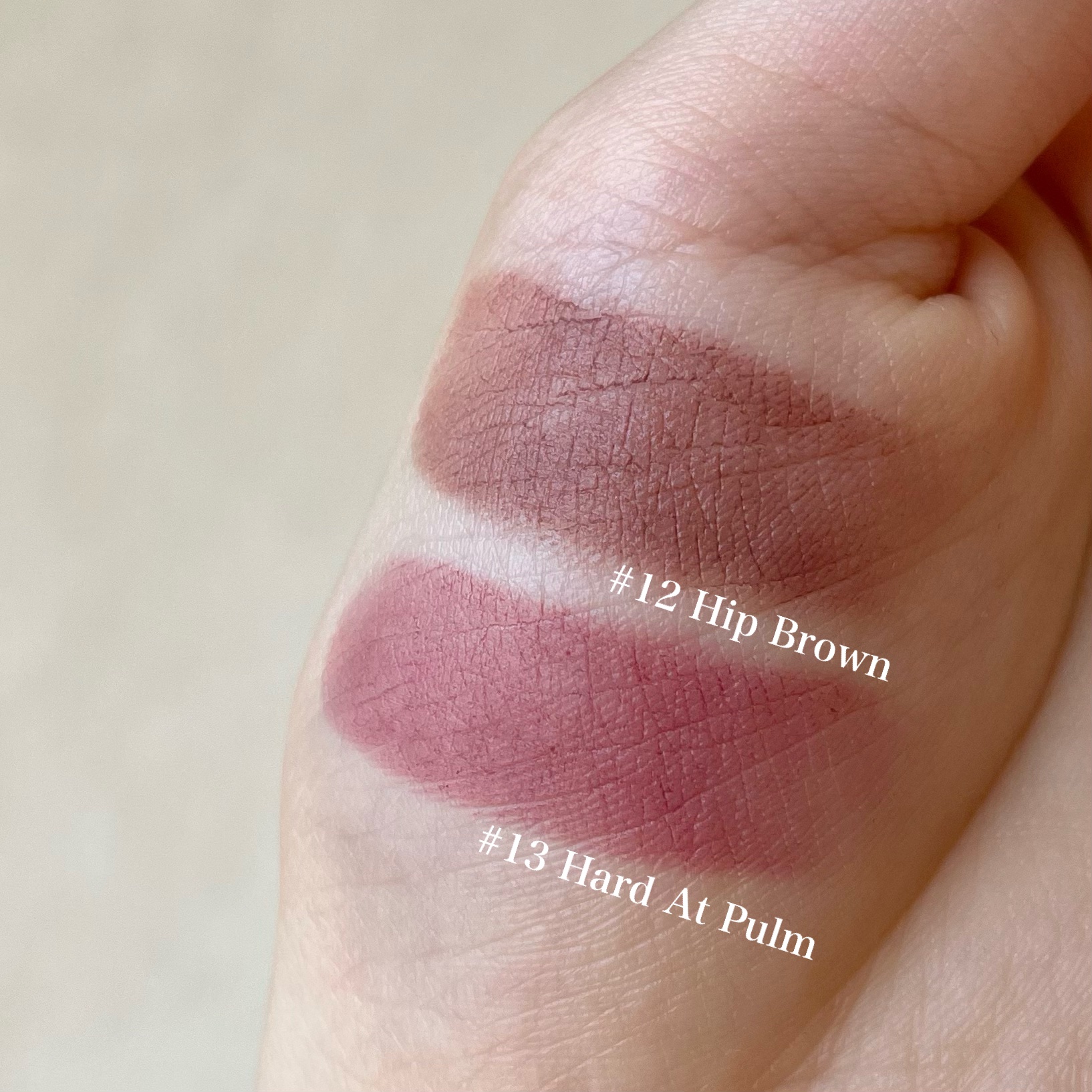 ブルベでも使いやすいピンクブラウンパレット☝🏻 オレンジ系のカラーが一切無いのでブルベさんの肌にも馴染みやすく、程よく赤みもあるので秋っぽさが一気に出ます🥰 左から4番目のシマーカラーはぷにぷにした質感で、ピンクベースに細かなラメが入っていて光沢感抜群✨️ マットリップの中では乾燥しにくく、色持ちもいいリップです💯 私のおすすめは特に12番のカラーで、彩度を最大限に落としたココアブラウンのようなカラーがたまらなくかわいいんです、、🫠