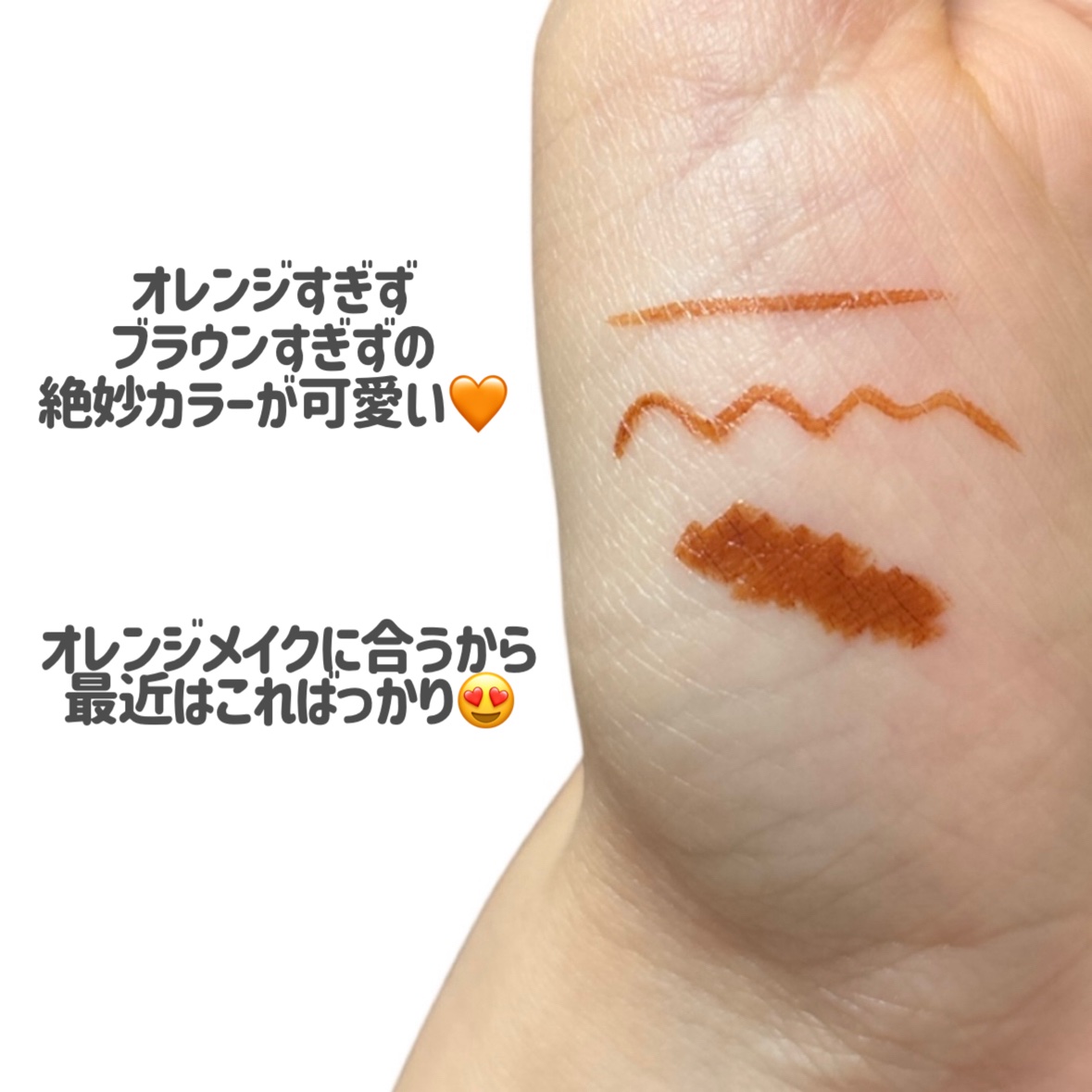 オレンジブラウンは、手に出すと結構鮮やか。目もとにひくとブラウンよりです。なので、オレンジアイライナー初めてでドキドキするという方にも使いやすい色味。花粉症とかで目をこする癖があるので、目尻が知らぬ間に消えてしまうこともありますが、初心者のか...