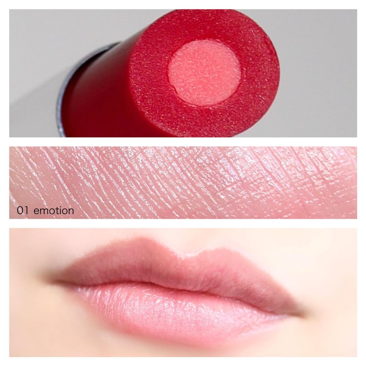 - 01 Emotion / エモーション (レッド×ピンク ) ほんのりとやさしく色づく透明感のある赤リップ。唇に自然な発色を作り出し、溶け込むような血色感を演出します。ピンクのやわらかさをプラスした上品で華やかさのある表情に。