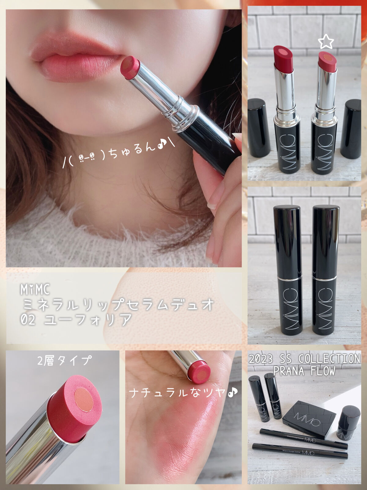 【MiMC】ケアしながらメイクする2層のリップ血色感UPのクリアレッドとフレッシュなパール入りピンクMiMCの2023春夏コレクションをいただいて使用してみました!❁✿✾…………………………✾✿❁︎【製品情報】MiMCミネラルリップセラムデュオ01エモーション/02ユーフォリア各4,180円(税込)❁✿✾…………………………✾✿❁︎【2023春夏コレクション『PRANAFLOW』】MiMCの2023春夏コレクションのテーマは『PRANAFLOW』一人ひとりの内側にあるエネルギー"プラーナ"を軽やかな透明感ある色彩で表現した新作です。【ケアしながらメイクする新作の2層リップ】新作リップのミネラルリップセラムデュオはCBD(カンナビジオール/保湿成分)配合のトリートメントベースの2層リップでケアしながらメイクできるのが特徴です。《01エモーション》透明感のあるレッド唇に自然な血色感をプラスする赤リップ《02ユーフォリア》パール入りのピンクフレッシュな可愛らしいピンクリップ個人的には透け感が可愛い01推しです。塗り心地はリップクリーム並に軽めで軽い保湿感、ベタベタ感なく使えます◎