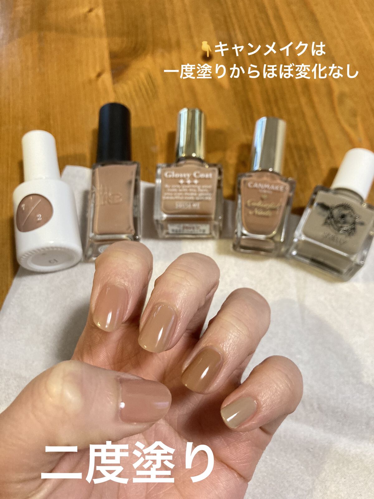 uka/ウカ ベージュスタディ ツー(7/2 kindly) ネイルホリック/ネイルホリック 24_7(BE382) スキューズミー/グロッシーコート(モンブランベージュ) キャンメイク/カラフルネイルズ(N55チャイティーラテ) SMELLY/マニキュア(350ヌカルミ) ukaはローズブラウンベージュ。だいぶ透け感が消える。 ネイルホリックはukaと比べると少し透け感が残る感じ。色は正直ほぼ違いがない。 スキューズミーは上二つと比べて少し黄みよりなベージュに。 キャンメイクはブラウンだね!まさにラテな柔らかい色!好きだ。 SMELLYはグレージュ。二度塗りでムラがなくなる。クールなカラー。 SMELLYはちょっとハケが小さくてムラになりやすいかな…それ以外は一度塗り写真で分かる通り、ムラになりにくく、不器用でもルンルンで塗れるネイルだと思う。一度塗りも二度塗りも楽しめる色。