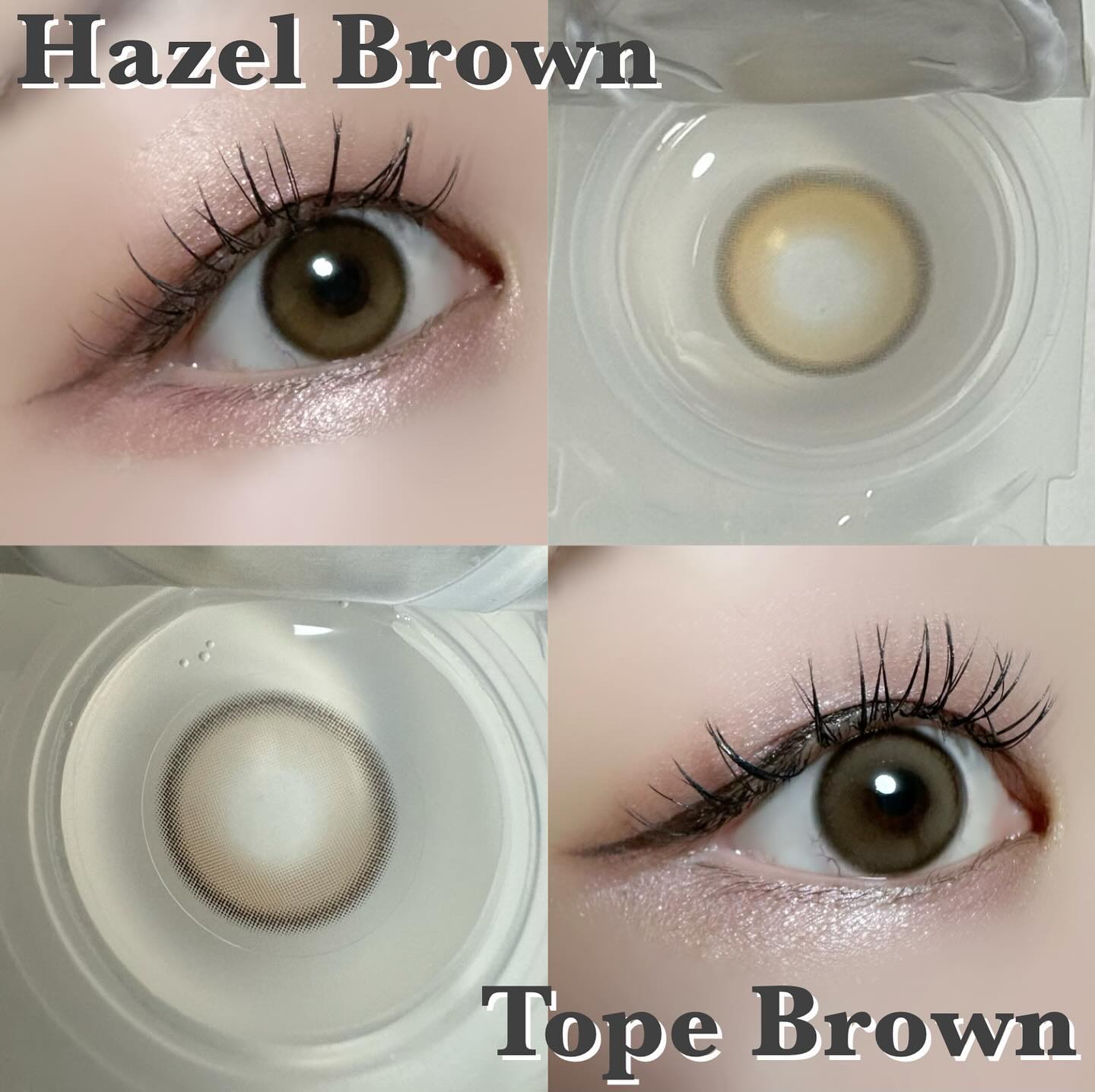 カラー構成が、トープ+ ブラウン + チョコ水光カラコンのようにグラデーションぽくなってる! 私は茶目ですが、結構明るめになるな〜と👀✨️奥行き感のある感じがでてるきが!ワンホンぽい😮 こちらのタイプは、マンスリーもありました🩷同じシリーズのヘーゼルブラウンのカラーも気になります😲🤍