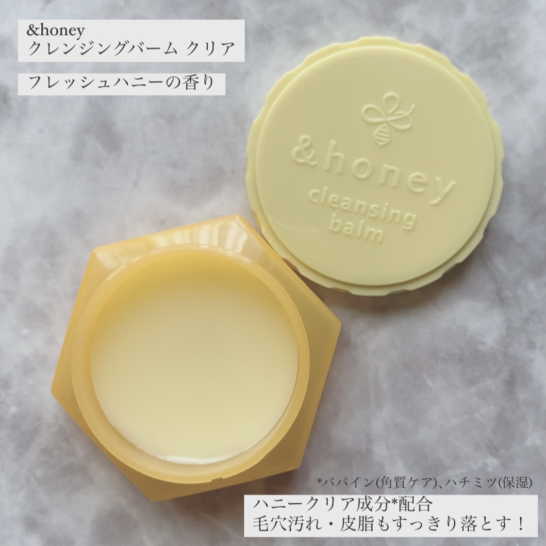 - 『&honey』から初のスキンケアシリーズ、クレンジングが誕生。 肌にうるおいを与えながら落とすハチミツ美容で、製品の90%以上をハチミツやアルガンオイル、オーガニックヒアルロン酸などの保湿&整肌成分で構成。 【クレンジングバーム クリア】 ・ハニークリア成分*を配合 毛穴汚れ・皮脂をケアしながらメイクをOFF。.さっぱり肌へ導きます。 ・1つで5役 メイク落とし・角質ケア・洗顔・マッサージ・保湿の5役 ・W洗顔不要。まつエクOK。パッチテスト済み。 ・無添加・フリー処方 合成着色料・パラベン・アルコール・動物実験フリー ・フレッシュハニーの香り* パパイン(角質ケア)、ハチミツ(保湿)