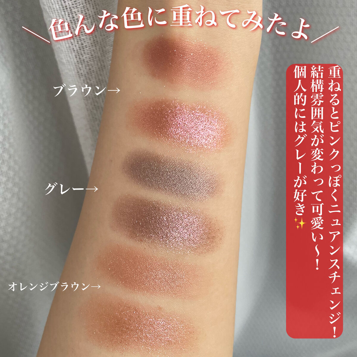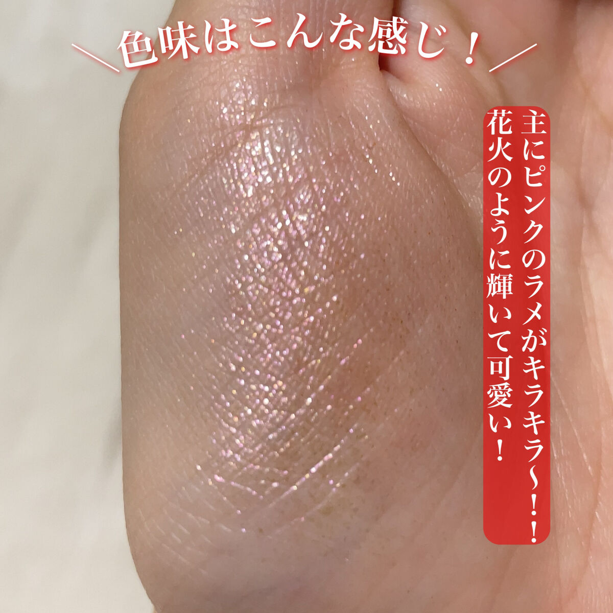 真っ赤な花火のような色合いで、ピンクのラメがキラキラしていて可愛い! トッピングするようにまぶたの真ん中に重ねただけでも可愛い。 他のアイシャドウ全体に重ねてニュアンスチェンジしてみてもかわいい! 結構しっとりしてるからラメ飛びは気にならない。 こちらのアイシャドウはただのラメアイシャドウではなく、ベースにほんのりレッドっぽいカラーがあるんです! 個人的にはグレーに重ねるのがオススメ! 1個持っておくだけで、普通のラメシャドウとしてだったり、重ねてニュアンスチェンジしたり、真ん中に重ねたり、、、 いくつかの使い方ができるので持っていて損はなし👌💕 ラメがキラキラゴージャスで可愛い〜! 可愛いしか言えない。 ニュアンスチェンジの可能性が爆発。