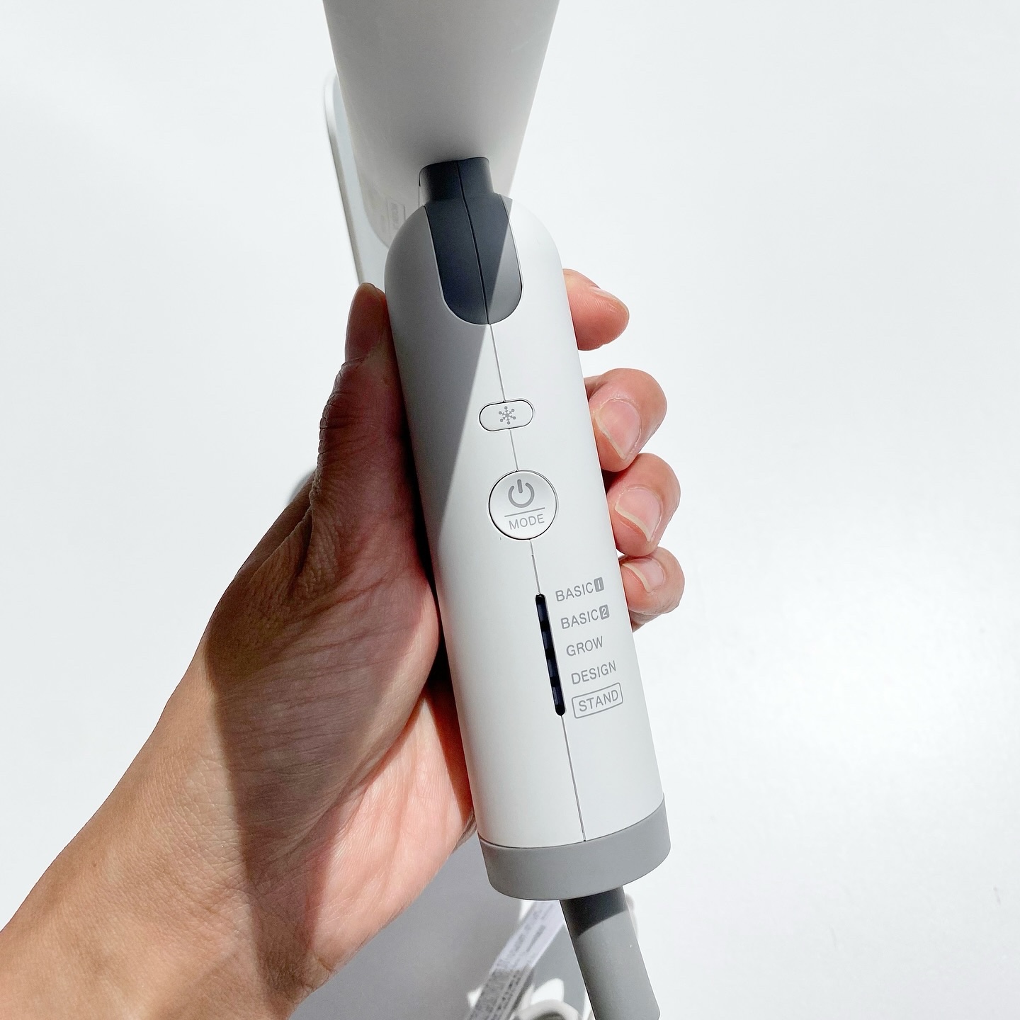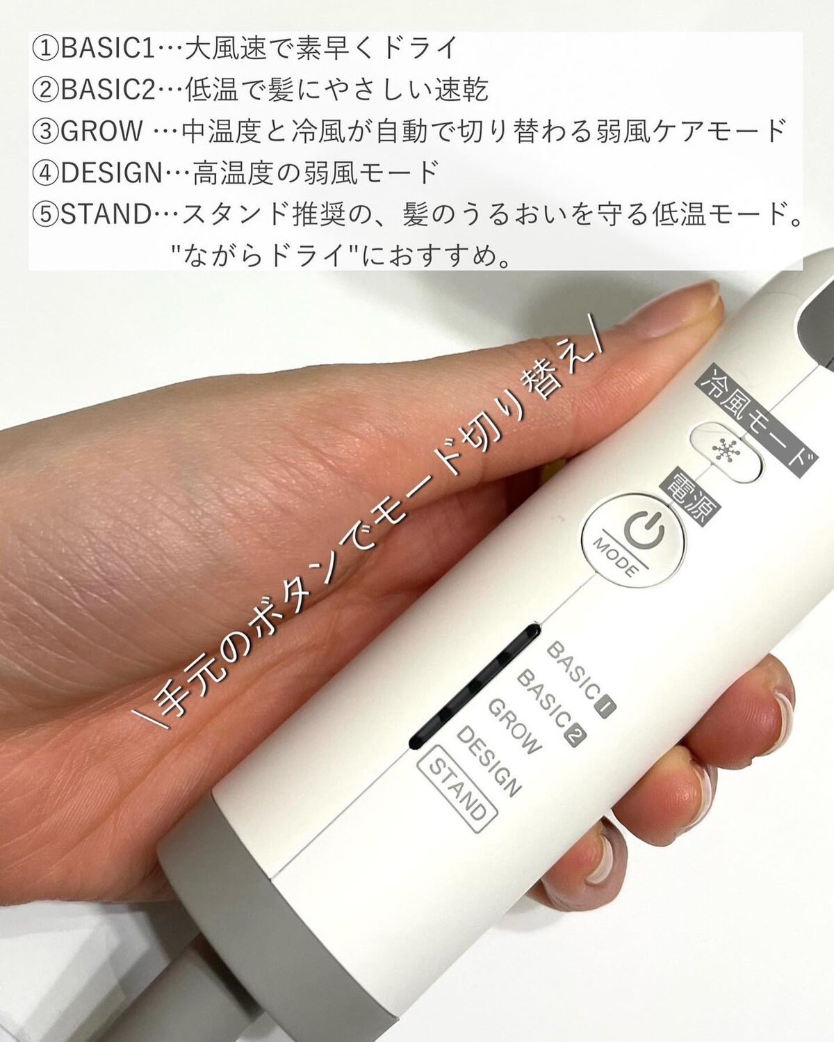 軽くてコンパクトなのに風量・風速が業界トップクラス😆 指どおりがよくてなめらかになるし癖毛と傷みで髪がまとまりづらいのですが、風が強いのに低温だからドライ後にまとまってました👏🏻 モードが何種類かありBASIC1の健やかな髪づくりの土台となってくれる速乾モードがイメージ、ダイソンの掃除機並みのパワーで驚き🤣 BASIC2はリファやレプロナイザーのような髪に優しい風✨より低温の風で髪を労ってくれ髪の毛の絡まりを防ぎながら乾かせます! GROWは中温度と冷風が自動で切り替わってくれ、水分の蒸発がしにくくなることで髪の潤いとツヤを守ってくれます🙆🏻♀️ STANDはこちらのドライヤーには専用スタンドがついているのですがそのスタンド使用推奨の低音モード!スマホを見ながらしたい時などハンズフリーにできるのいいですよね🥰 コンパクトで軽量なので持ち運びにも便利👏🏻