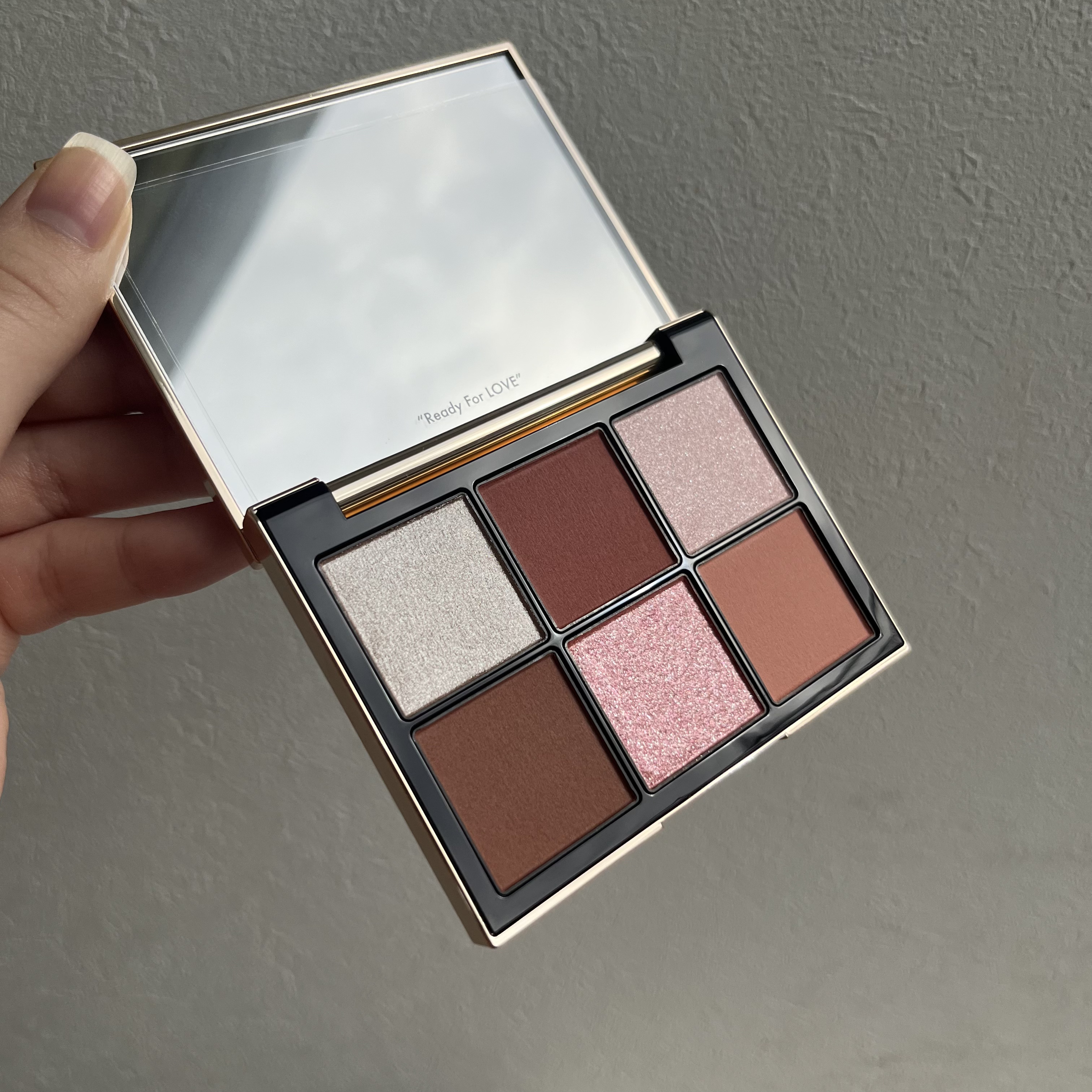 甘いメイク、ピンク系好きな人は絶対好き! パッケージは、ゴールドでルナソルみたいな感じの素材。 シンプルなハート柄が描かれていて好きです◎ チップ、ブラシは無しなので手持ちのブラシ、チップが必要になります。 ラメ系が3色、マット系が3色のパレット。 綺麗なグラデーションがしやすく、単色使いでも使いやすく ラメが綺麗でこのラメだけでも華やかさがでるので オススメのアイシャドウパレットです.*・゚