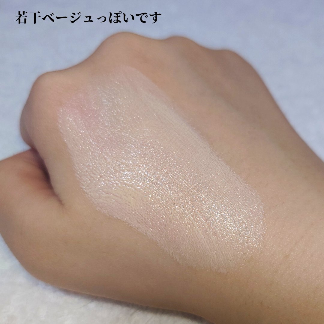 黄色よりのクリームベージュみたいな柔らかいお色味。 テクスチャーはサラサラとしすぎず、ゆるゆるしすぎずするすると伸びがいい使用感です。 お肌にぴたーっと密着感も高く、程よくトーンアップしてくれます。 白浮きしすぎない透明感のある仕上がり、そして自然なツヤ感! UVカット効果ものあるので、お出掛けしない日はこれだけでも十分なほど。 ベタベタしない、しっとりするような使い心地、香りがいいのも気に入ってます。
